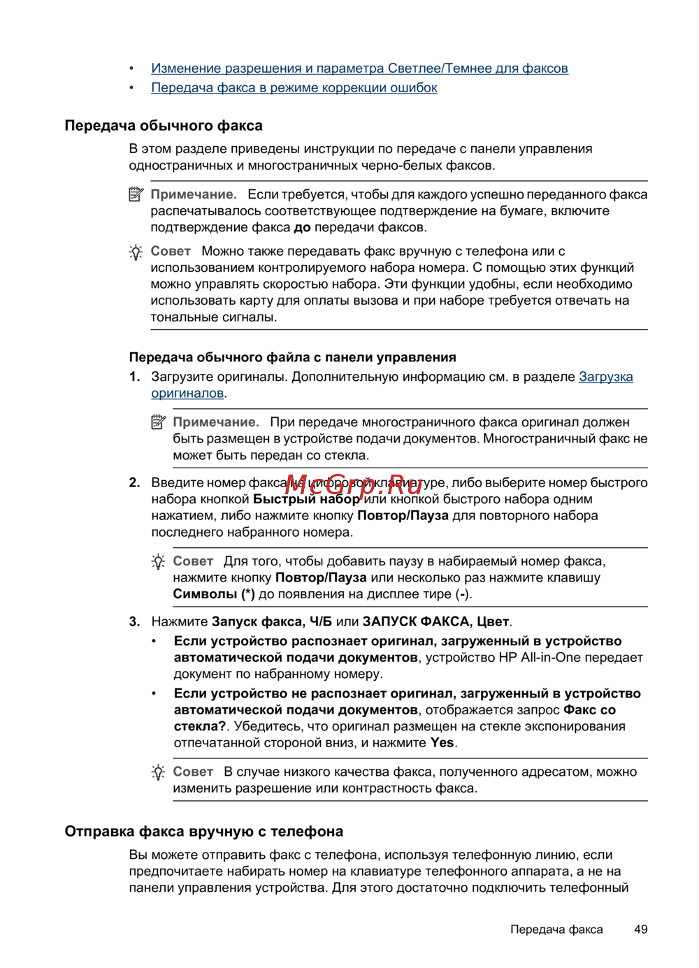 Совет Можно также передавать факс вручную с телефона или с