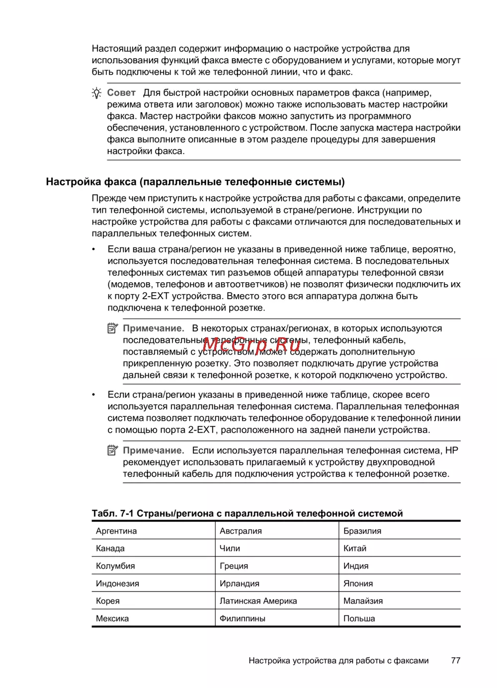 Табл. 7-1 Страны/региона с параллельной телефонной системой