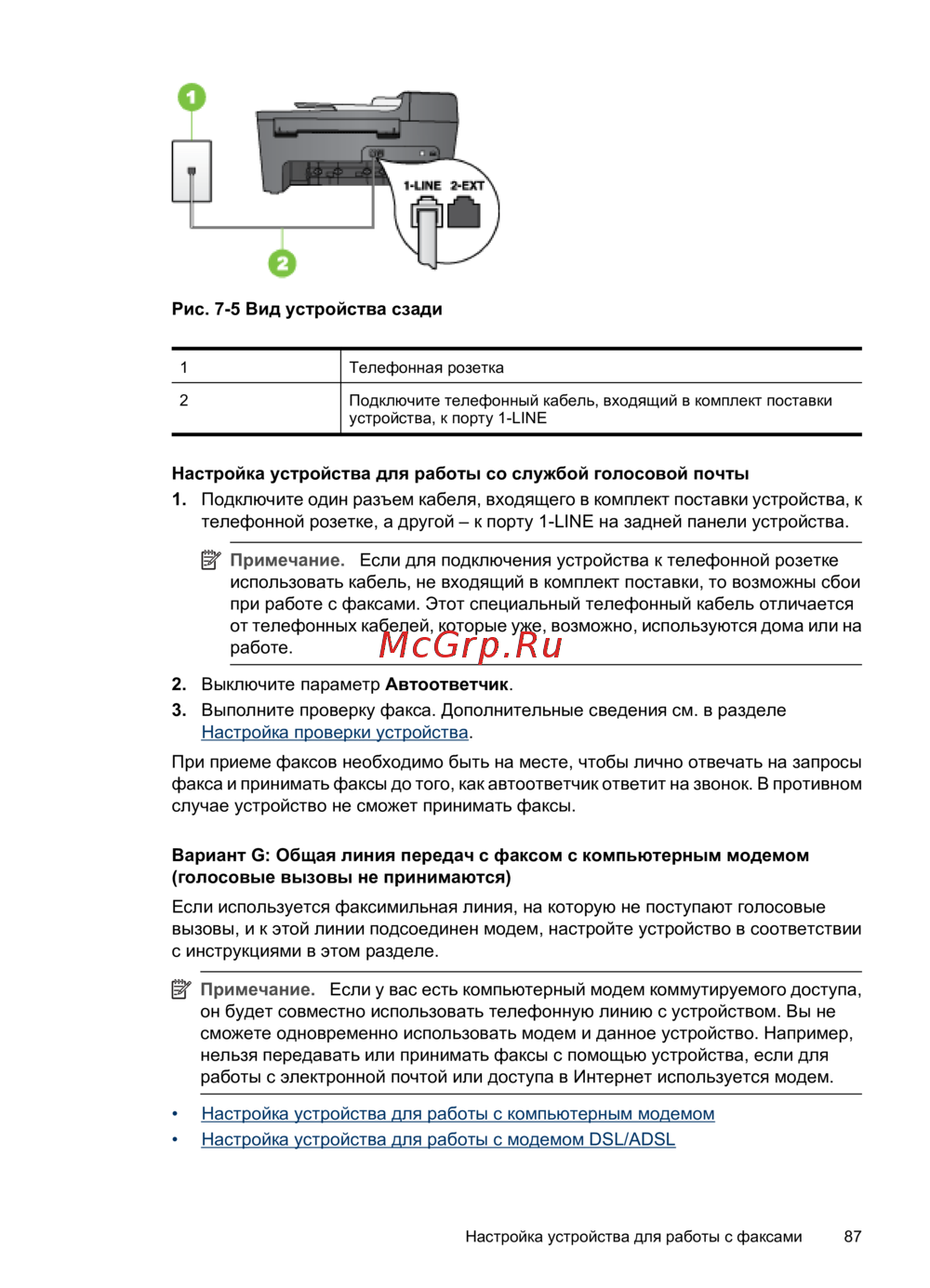 Вариант G: Общая линия передач с факсом с компьютерным модемом