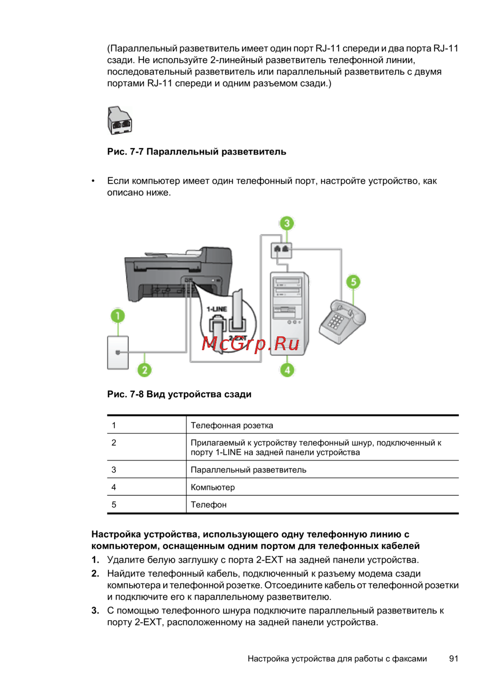 • Если компьютер имеет один телефонный порт, настройте устройство, как