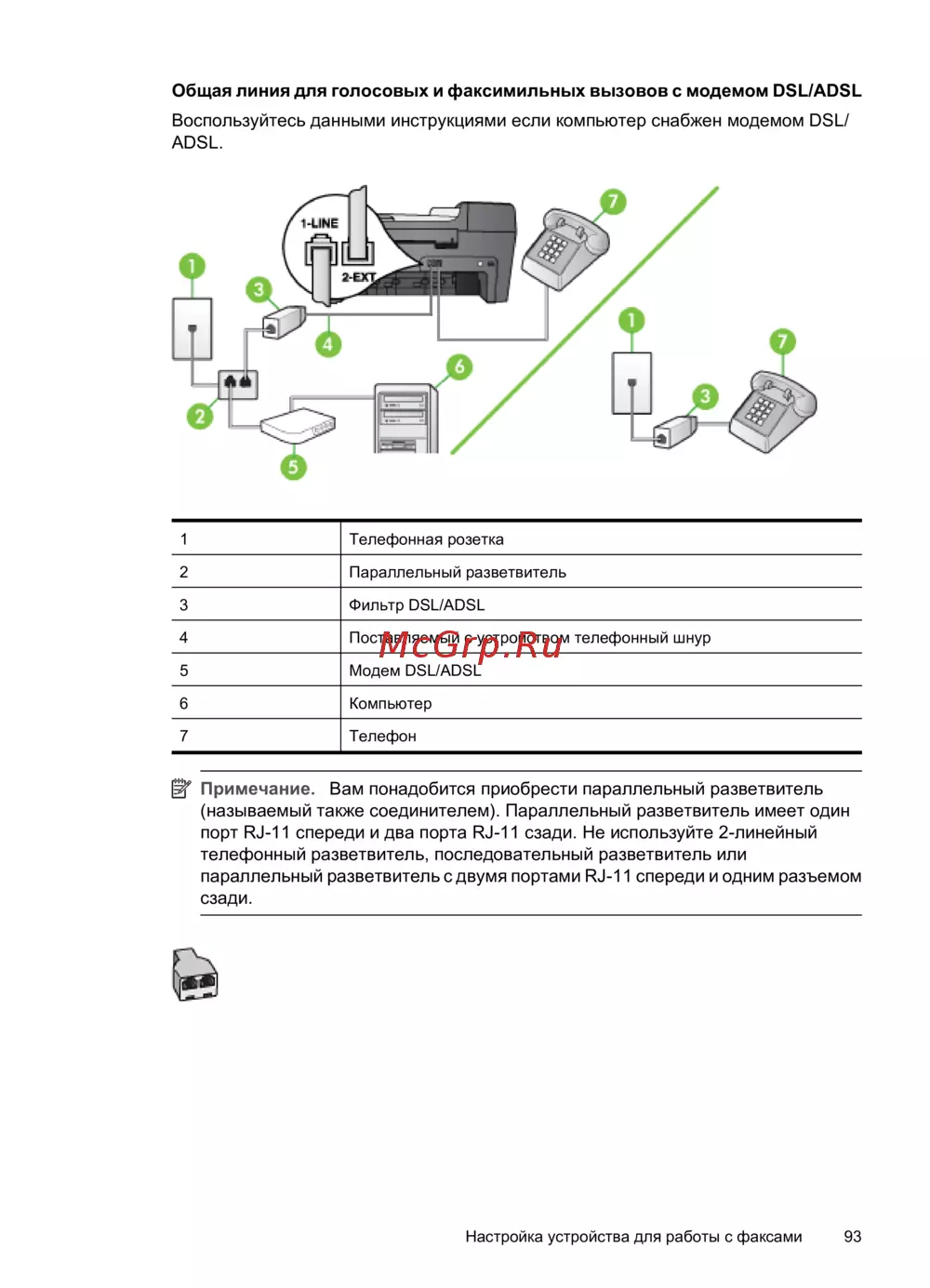HP OfficeJet J5520 [97/202] Примечание вам понадобится приобрести параллельный разветвитель называемый также соединителем параллельный разветвитель имеет один порт rj 11 спереди и два порта rj 11 сзади не используйте 2 линейный телефонный разветвитель последовательный разветвитель или параллельный разветвитель с двумя портами rj 11 спереди и одним разъемом сзади