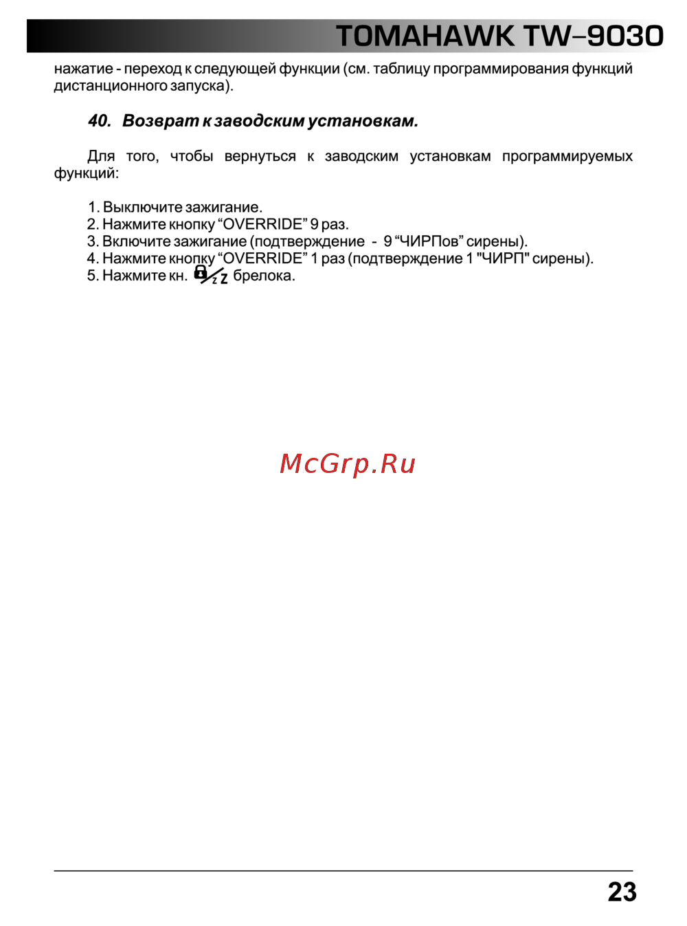 TOMAHAWK TW 9030 нажатие переход к следующей функции см таблицу программирования функций дистанционного запуска 40 Возврат к заводским установкам Для того чтобы вернуться к заводским установкам программируемых функций 1 Выключите зажигание 2 Нажмите кнопку OVERRIDE 9 раз 3 Включите зажигание подтверждение 9 ЧИРПов сирены 4 Нажмите кнопку OVERRIDE 1 раз подтверждение 1 ЧИРП сирены 5 Нажмите кн брелока 23