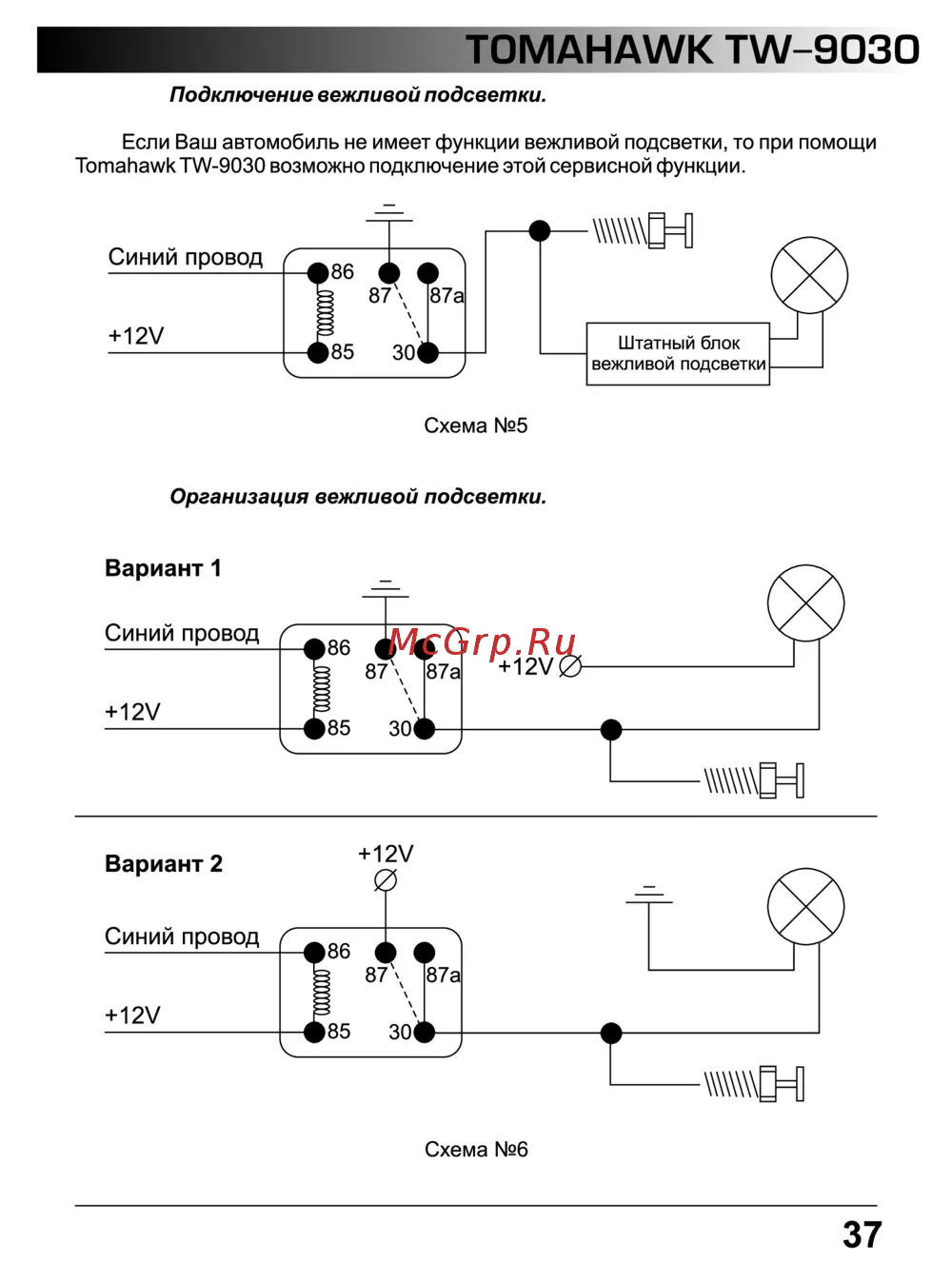 TOMAHAWK TW 9030 Подключение вежливой подсветки Если Ваш автомобиль не имеет функции вежливой подсветки то при помощи TomahawkTW 9030 возможно подключение этой сервисной функции Схема 5 Организация вежливой подсветки Схема 6 37