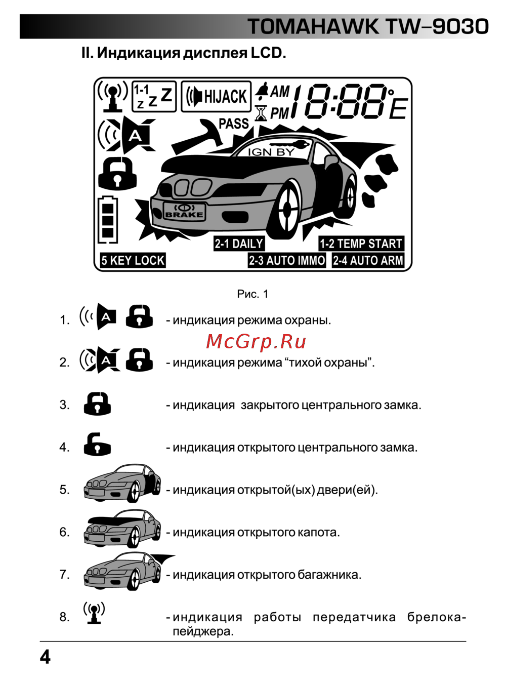 TOMAHAWK TW 9030 II Индикация дисплея LCD Рис 1 1 в индикация режима охраны ф ф индикация режима тихой охраны 4 индикация закрытого центрального замка индикация открытого центрального замка 5 индикация открытой ых двери ей 6 индикация открытого капота 7 индикация открытого багажника 8 индикация работы передатчика брелокапейджера