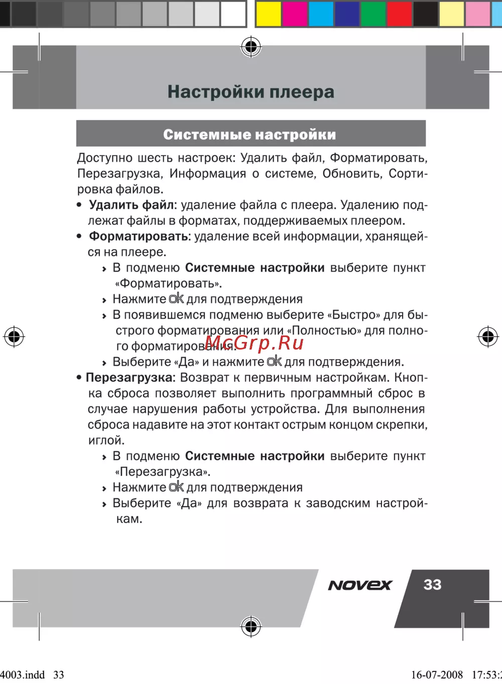 Системные настройки Доступно шесть настроек Удалить файл Форматировать Перезагрузка Информация о системе Обновить Сорти ровка файлов Удалить файл удаление файла с плеера Удалению под лежат файлы в форматах поддерживаемых плеером Форматировать удаление всей информации хранящей ся на плеере В подменю Системные настройки выберите пункт Форматировать НажмитеОкдля подтверждения В появившемся подменю выберите Быстро для бы строго форматирования или Полностью для полно го форматирования Выберите Да и нажмитеОк для подтверждения Перезагрузка Возврат к первичным настройкам Кноп ка сброса позволяет выполнить программный сброс в случае нарушения работы устройства Для выполнения сброса надавите на этот контактострым концом скрепки иглой В подменю Системные настройки выберите пункт Перезагрузка НажмитеОкдля подтверждения Выберите Да для возврата к заводским настрой кам Novex