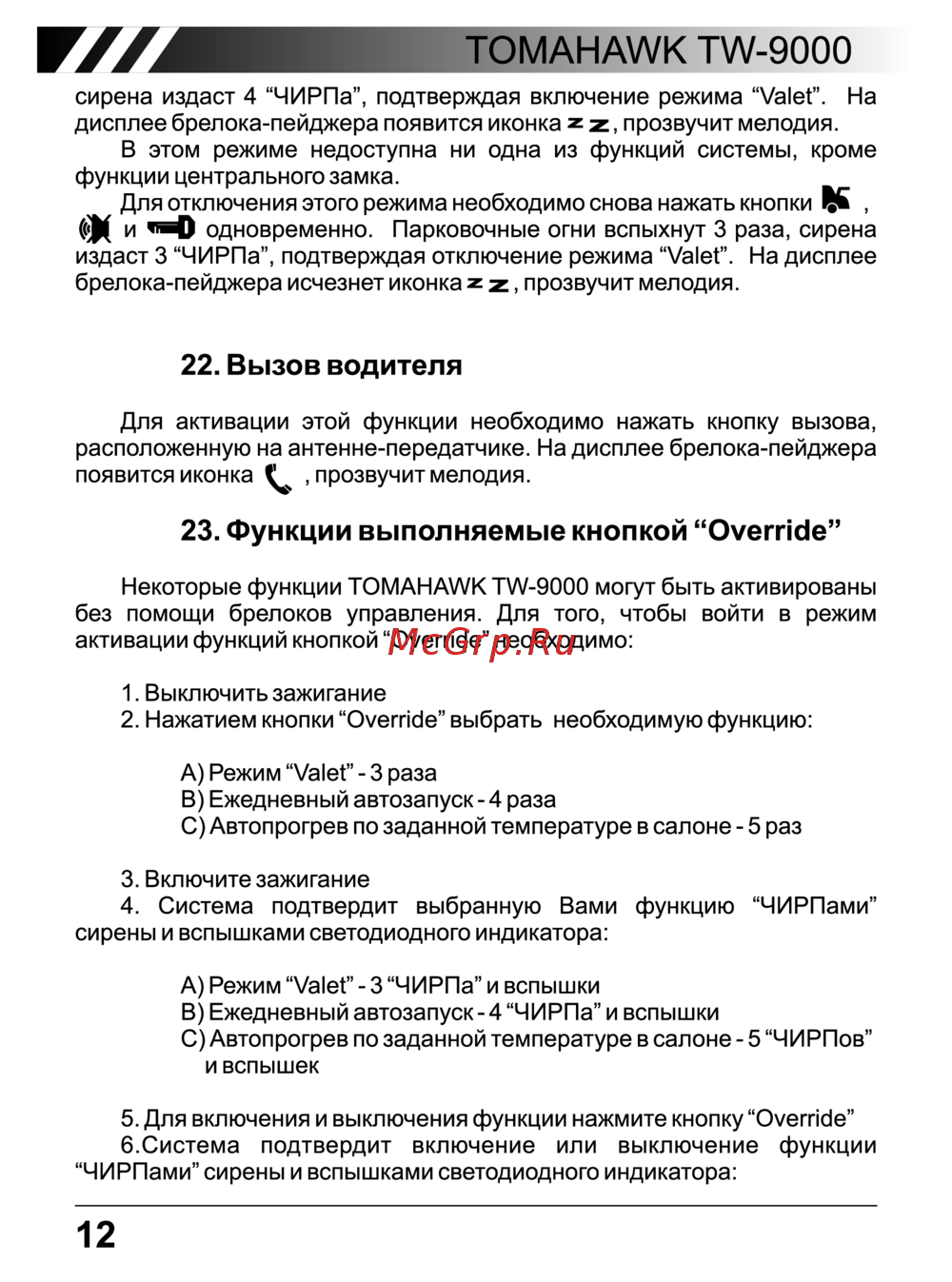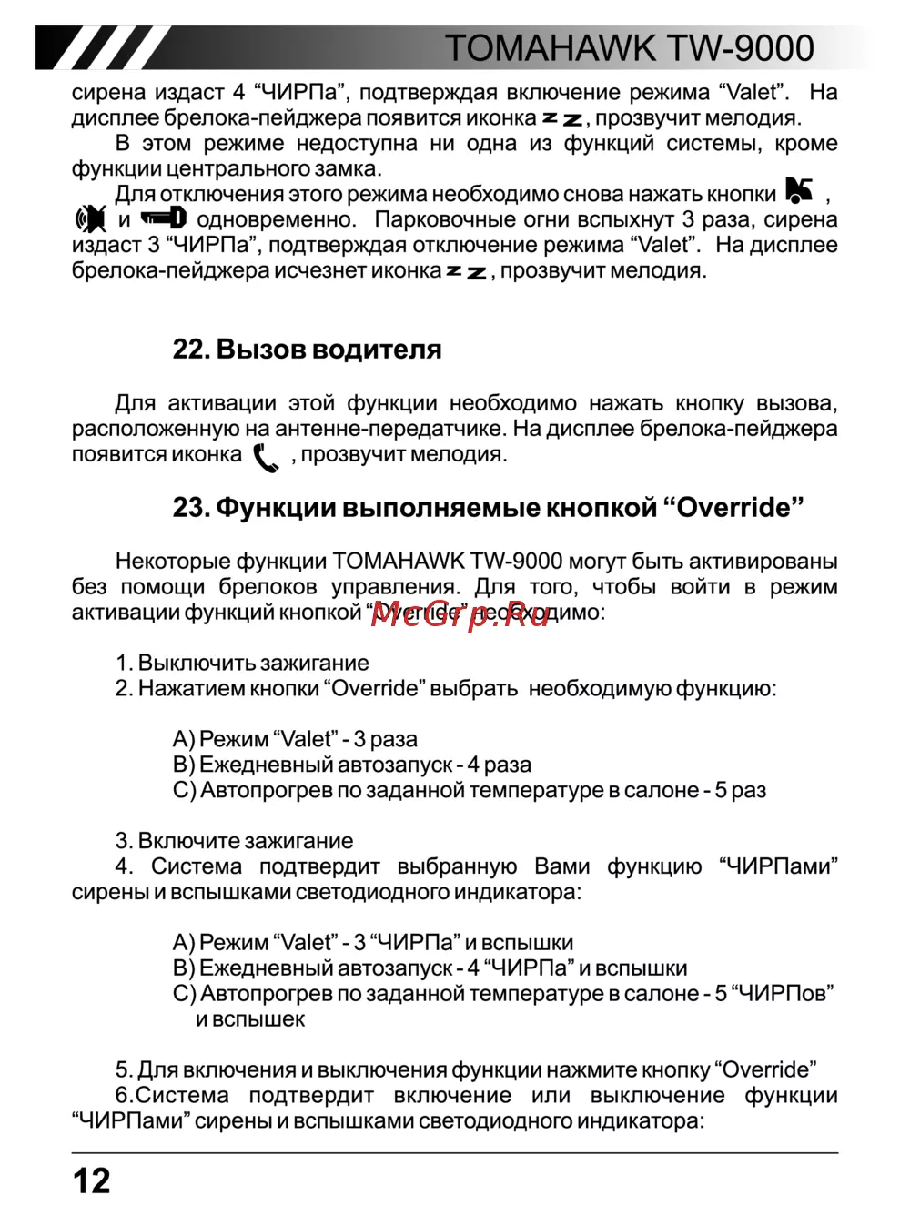 TOMAHAWK TW 9000 сирена издаст 4 ЧИРПа подтверждая включение режима Valet На дисплее брелока пейджера появится иконка z z прозвучит мелодия В этом режиме недоступна ни одна из функций системы кроме функции центрального замка Для отключения этого режима необходимо снова нажать кнопки К и одновременно Парковочные огни вспыхнут 3 раза сирена издаст 3 ЧИРПа подтверждая отключение режима Valet На дисплее брелока пейджера исчезнет иконка z z прозвучит мелодия 22 Вызов водителя Для активации этой функции необходимо нажать кнопку вызова расположенную на антенне передатчике На дисплее брелока пейджера появится иконка прозвучит мелодия 23 Функции выполняемые кнопкой Override Некоторые функции TOMAHAWK TW 9000 могут быть активированы без помощи брелоков управления Для того чтобы войти в режим активации функций кнопкой Override необходимо 1 Выключить зажигание 2 Нажатием кнопки Override выбрать необходимую функцию А Режим Valet 3 раза В Ежедневный автозапуск 4 раза С Автопрогрев по заданной температуре в салоне 5 раз 3 Включите зажигание 4 Система подтвердит выбранную Вами сирены и вспышками светодиодного индикатора функцию ЧИРПами А Режим Valet 3 ЧИРПа и вспышки В Ежедневный автозапуск 4 ЧИРПа и вспышки С Автопрогрев по заданной температуре в салоне 5 ЧИРПов и вспышек 5 Для включения и выключения функции нажмите кнопку Override 6 Система подтвердит включение или выключение функции ЧИРПами сирены и вспышками светодиодного индикатора 12