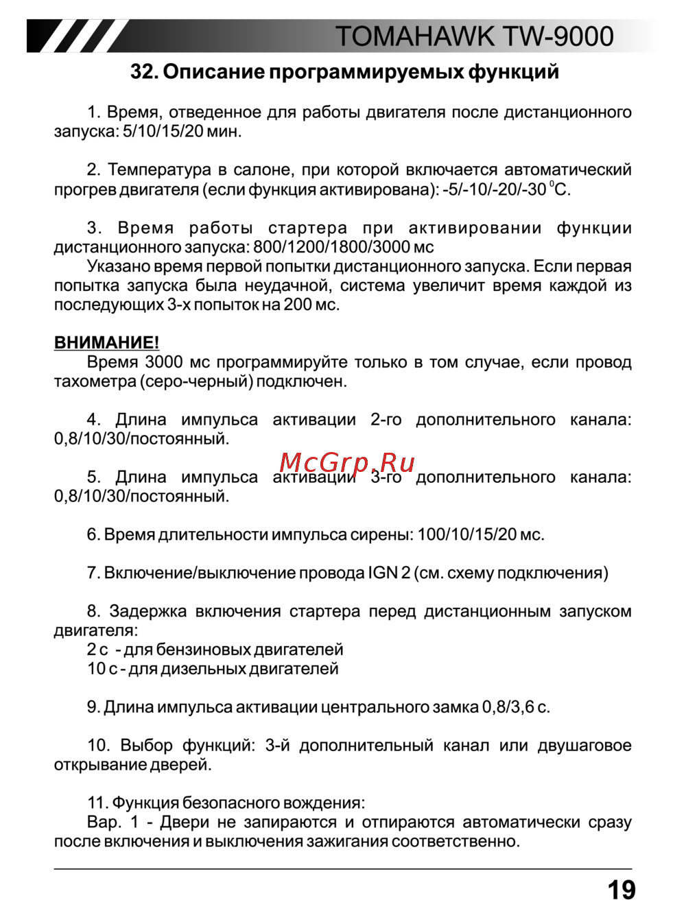 TOMAHAWK TW 9000 32 Описание программируемых функций 1 Время отведенное для работы двигателя после дистанционного за пуска 5 10 15 20 м и н 2 Температура в салоне при которой включается автоматический прогрев двигателя если функция активирована 5 10 20 30 C 3 Время работы стартера при активировании функции дистанционного запуска 800 1200 1800 3000 мс Указано время первой попытки дистанционного запуска Если первая попытка запуска была неудачной система увеличит время каждой из последующих 3 х попыток на 200 мс ВНИМАНИЕ Время 3000 мс программируйте только в том случае если провод тахометра серо черный подключен 4 Длина импульса 0 8 10 30 постоя н н ы й активации 2 го дополнительного канала 5 Длина импульса 0 8 10 30 постоя н н ы й активации 3 го дополнительного канала 6 Время длительности импульса сирены 100 10 15 20 мс 7 Включение выключение провода IGN 2 см схему подключения 8 Задержка включения стартера перед дистанционным запуском двигателя 2 с для бензиновых двигателей 10 с для дизельных двигателей 9 Длина импульса активации центрального замка 0 8 3 6 с 10 Выбор функций 3 й дополнительный канал или двушаговое открывание дверей 11 Функция безопасного вождения Вар 1 Двери не запираются и отпираются автоматически сразу после включения и выключения зажигания соответственно 19
