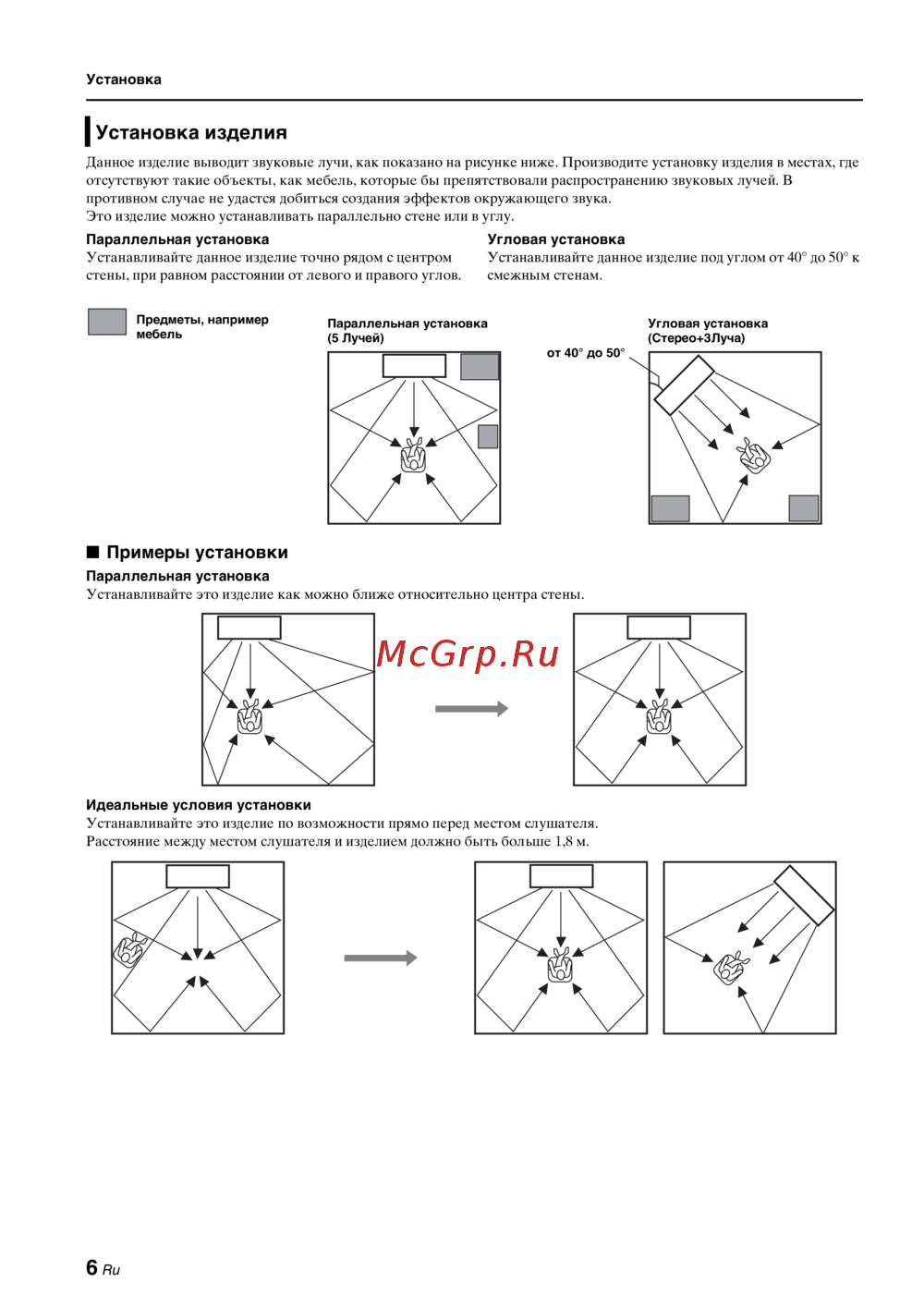 - Установка в непрямоугольной комнате установите аппарат таким образом чтобы звуковые лучи могли отражаться от стен p.9