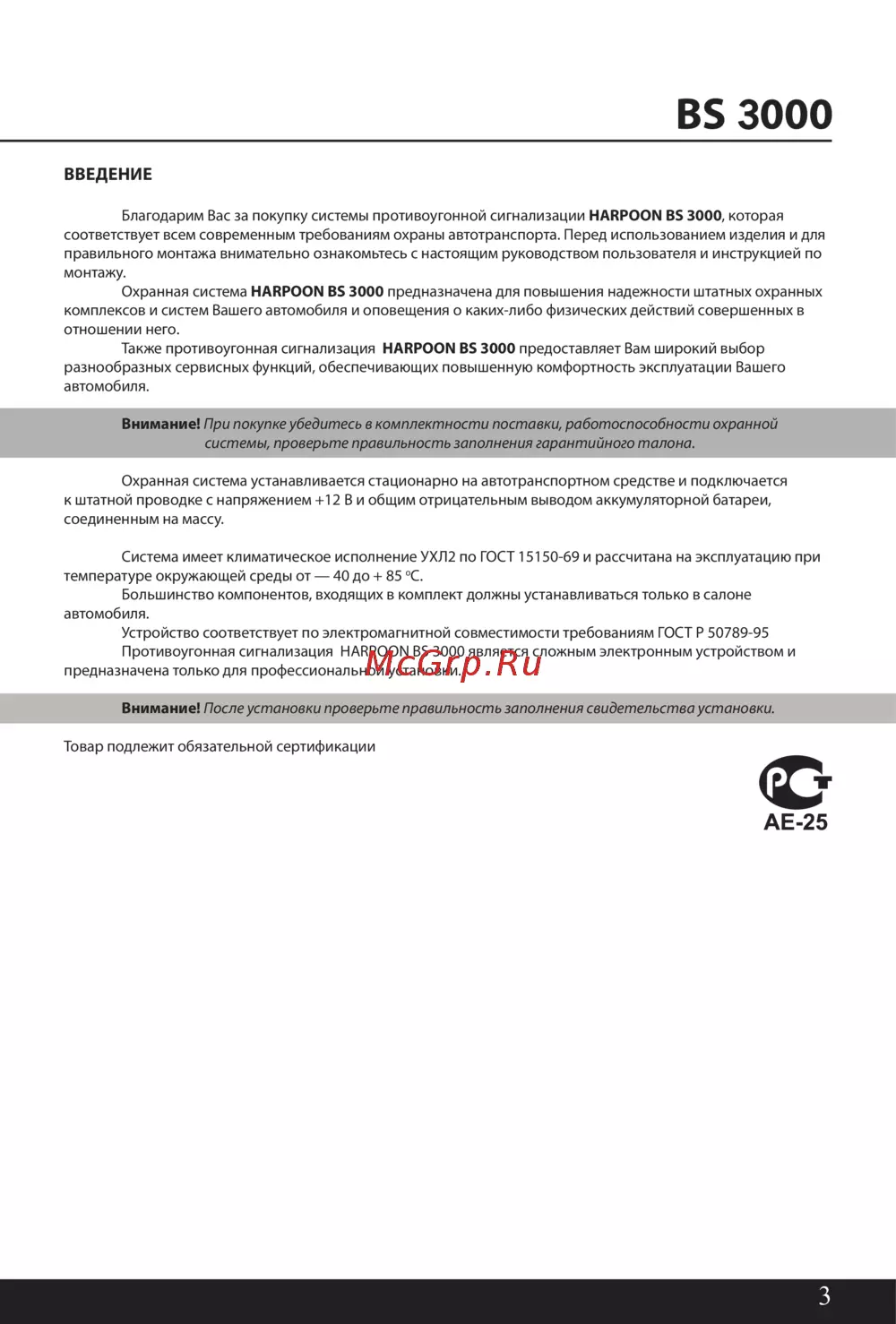 Благодарим Вас за покупку системы противоугонной сигнализации HARPOON BS 3000, которая