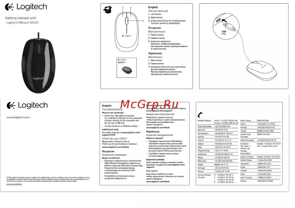 Logitech English Mouse features 1 Left button Getting started with 2 Right button 3 Scroll wheel Press for middle button Function varies by application Logitech Mouse M150 По русски Функции мыши 1 Левая кнопка 2 Правая кнопка 3 Колесико прокрутки Нажмите чтобы использовать как среднюю кнопку Функция зависит от приложения УкраТнська ФуНКЦ11МИШ1 1 Hiea кнопка 2 Права кнопка 3 Кол щатко Натиснггъ для виконання функцнсередным кнопки Функц1я зм нюсться зал ежи о вщ програмного забезпечення Logitech English Troubleshooting Mouse not working www logitech com Дополнительная справка n Электронная справка находится по адресу www logitecn com support _ Каково ваше впечатление7 Check the USB cable connection _ Try a different USB port on the computer Пожалуйста уделите минуту 4to6n поделиться с нами своим мнением Connect directly to the computer and do not use a USB hub Благодарим за приобретение к нашего продукта Try the mouse on a different surface www logitecn com ithink Additional help support mios Укра нська Усуненмя несправносгей What do you think Миша не працюе For online help go to www logltech com Please take a minute to tell us Thank you for purchasing our product nepeeipre подключения USB кабелю Спробуйте скормстатись ншим USB www logltech com lthlnk рт0 на Подключайте йога безпосередньодо комп ютера та не використовуйте USB концентратор Спробуйтескористатисямишею По русски Мнение неполадок Мышь не работает _ Додаткова дов дка Проверьте правильность подключения т гчтчUSB кабелей Попробуйте подключить офимаги доводку в режим онлайн кабель к другому USB порту компьютера перейд ть за адресою www logitech com Подключитесь непосредственно support к компьютеру не используя USBконцентратор 2012 Logitech Al rights reserved Logitech the Logitech logo and other LOQtech marks are owned by Logitech and may oe registered Ai other troger iar s are the roc er t v of their rescectr e owners ogrtech assures ro esoorsitilth tar any errors that may appear in this manual Information contained herein is subject to change without notice 620 004178 002 Попробуйте использовать мышь на другой поверхности Ваш Думки _ Будь ласка подшггься з нами своими враженнями Дякуемо за покупку нашого продукту www logitech com ithink Belgiö BelgiQue Dutch 32 О 2 200 6d 44 South Africa 0800 981 089 _________________ French 3240 2 200 64 40 Suomi 35840 9 72519108 uata кейджа 4640 8 501632 83 Svejge 45 38 32 3120___________ 00800 44 B82 5862 Türklye ueutschlang 4940 69 51 ruu 42 _________ UniledArab Espana 34 91 275 45 88 6000 441 4294 Emirates France 33 0 l 57 52 52 71 United Kingdom 4440 203 024 81 S9 Ireland 355 0 l 524 50 80 European English 41 0 22 761 40 25 Italia 39 02 9148 30 31 Mid East Far 4140 21863 Magyarorszag 36 1 777 4853___________ Morges Nederland 31 O 2O 2OO 84 33 Norpe 4740 24 159 579 Eastern Europe English 4 O 22 761 40 25 Österreich 4340 1206 091026 United States 1646 454 3200 Polska 00800 4411719 Argentina 0800 555 3284 Portugal 351 21 415 9016 B 1 0800 8914173 Россия 7 495 64134 60 Canada 1 866 934 5644 Schweiz Suisse 0 4140 22 7614012 e_______________ 1230 020 5484____________ Svizzera F 4140 22 7614016 Latin America Ё 54 02 Switzerland 1800 578 9619