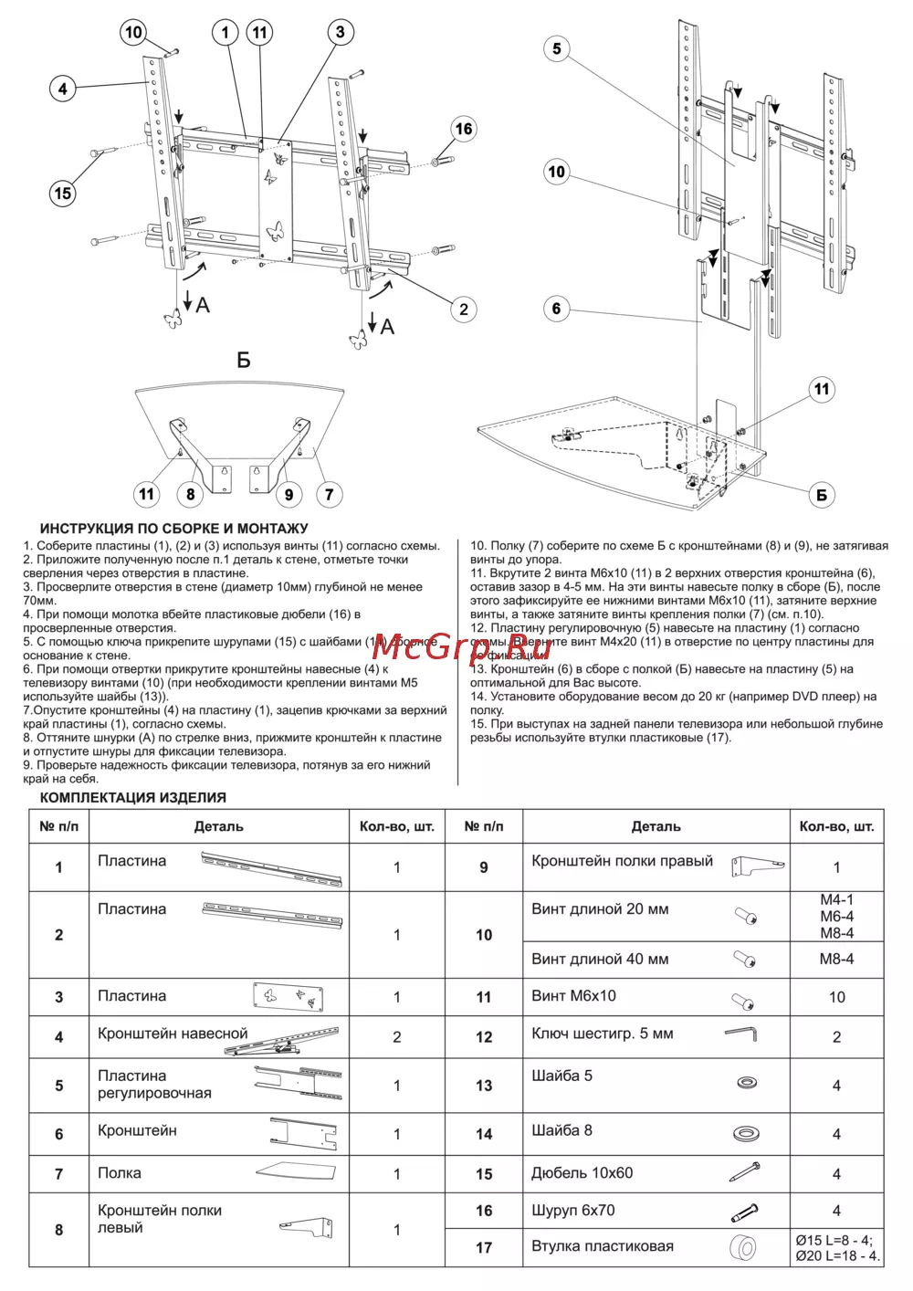 ИНСТРУКЦИЯ ПО СБОРКЕ И МОНТАЖУ 1 Соберите пластины 1 2 и 3 используя винты 11 согласно схемы 2 Приложите полученную после п 1 деталь к стене отметьте точки сверления через отверстия в пластине 3 Просверлите отверстия в стене диаметр 10мм глубиной не менее 70мм 4 При помощи молотка вбейте пластиковые дюбели 16 в просверленные отверстия 5 С помощью ключа прикрепите шурупами 15 с шайбами 14 сборное основание к стене 6 При помощи отвертки прикрутите кронштейны навесные 4 к телевизору винтами 10 при необходимости креплении винтами М5 используйте шайбы 13 7 Опустите кронштейны 4 на пластину 1 зацепив крючками за верхний край пластины 1 согласно схемы 8 Оттяните шнурки А по стрелке вниз прижмите кронштейн к пластине и отпустите шнуры для фиксации телевизора 9 Проверьте надежность фиксации телевизора потянув за его нижний край на себя 10 Полку 7 соберите по схеме Б с кронштейнами 8 и 9 не затягивая винты до упора 11 Вкрутите 2 винта МбхЮ 11 в 2 верхних отверстия кронштейна 6 оставив зазор в 4 5 мм На эти винты навесьте полку в сборе Б после этого зафиксируйте ее нижними винтами МбхЮ 11 затяните верхние винты а также затяните винты крепления полки 7 см п 10 12 Пластину регулировочную 5 навесьте на пластину 1 согласно схемы Вверните винт М4х20 11 в отверстие по центру пластины для ее фиксации 13 Кронштейн 6 в сборе с полкой Б навесьте на пластину 5 на оптимальной для Вас высоте 14 Установите оборудование весом до 20 кг например DVD плеер на полку 15 При выступах на задней панели телевизора или небольшой глубине резьбы используйте втулки пластиковые 17 КОМПЛЕКТАЦИЯ ИЗДЕЛИЯ п п 1 Деталь Пластина Пластина Кол во шт п п 1 9 Деталь Кронштейн полки правый 1 4 1 М4 1 М6 4 М8 4 10 Винт длиной 40 мм Пластина а Винт длиной 20 мм 2 3 Кол во шт X М8 4 1 11 Винт МбхЮ Кронштейн навесной д 2 12 Ключ шестигр 5 мм 5 Пластина регулировочная 1 13 6 Кронштейн 1 14 Шайба 8 4 7 Полка 1 15 Дюбель 10x60 4 Кронштейн полки левый 16 Шуруп 6x70 4 8 17 Втулка пластиковая 22222 I 10 П 2 4 Шайба 5 1 015 L 8 4 020 L 18 4