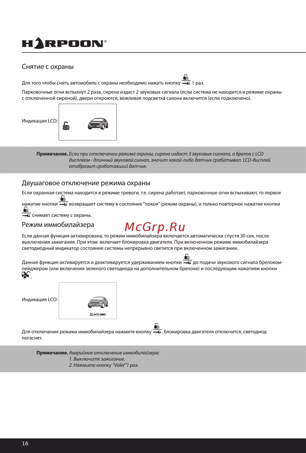 HIRPOOIM Снятие с охраны Для того чтобы снять автомобиль с охраны необходимо нажать кнопку 1 раз Парковочные огни вспыхнут 2 раза сирена издаст 2 звуковых сигнала если система не находится в режиме охраны с отключенной сиреной двери откроются вежливая подсветка салона включится если подключено Индикация LCD Примечание Если при отключении режима охраны сирена издаст 3 звуковых сигнала а брелок с LCD дисплеем длинный звуковой сигнал значит какой либо датчик срабатывал LCD дисплей отобразит сработавший датчик Двушаговое отключение режима охраны Если охранная система находится в режиме тревоги т е сирена работает парковочные огни вспыхивают то первое а нажатие кнопки мэ возвращает систему в состояние покоя режим охраны и только повторное нажатие кнопки о снимает систему с охраны Режим иммобилайзера Если данная функция активирована то режим иммобилайзера включается автоматически спустя 30 сек после выключения зажигания При этом включает блокировка двигателя При включенном режиме иммобилайзера светодиодный индикатор состояния системы непрерывно светится при включенном зажигании Данная функция активируется и деактивируется удерживанием кнопки до подачи звукового сигнала брелокомпейджером или включения зеленого светодиода на дополнительном брелоке и последующим нажатием кнопки Индикация LCD Для отключения режима иммобилайзера нажмите кнопку мз блокировка двигателя отключится светодиод погаснет Примечание Аварийное отключение иммобилайзера 1 Выключите зажигание 2 Нажмите кнопку Valet раз 16