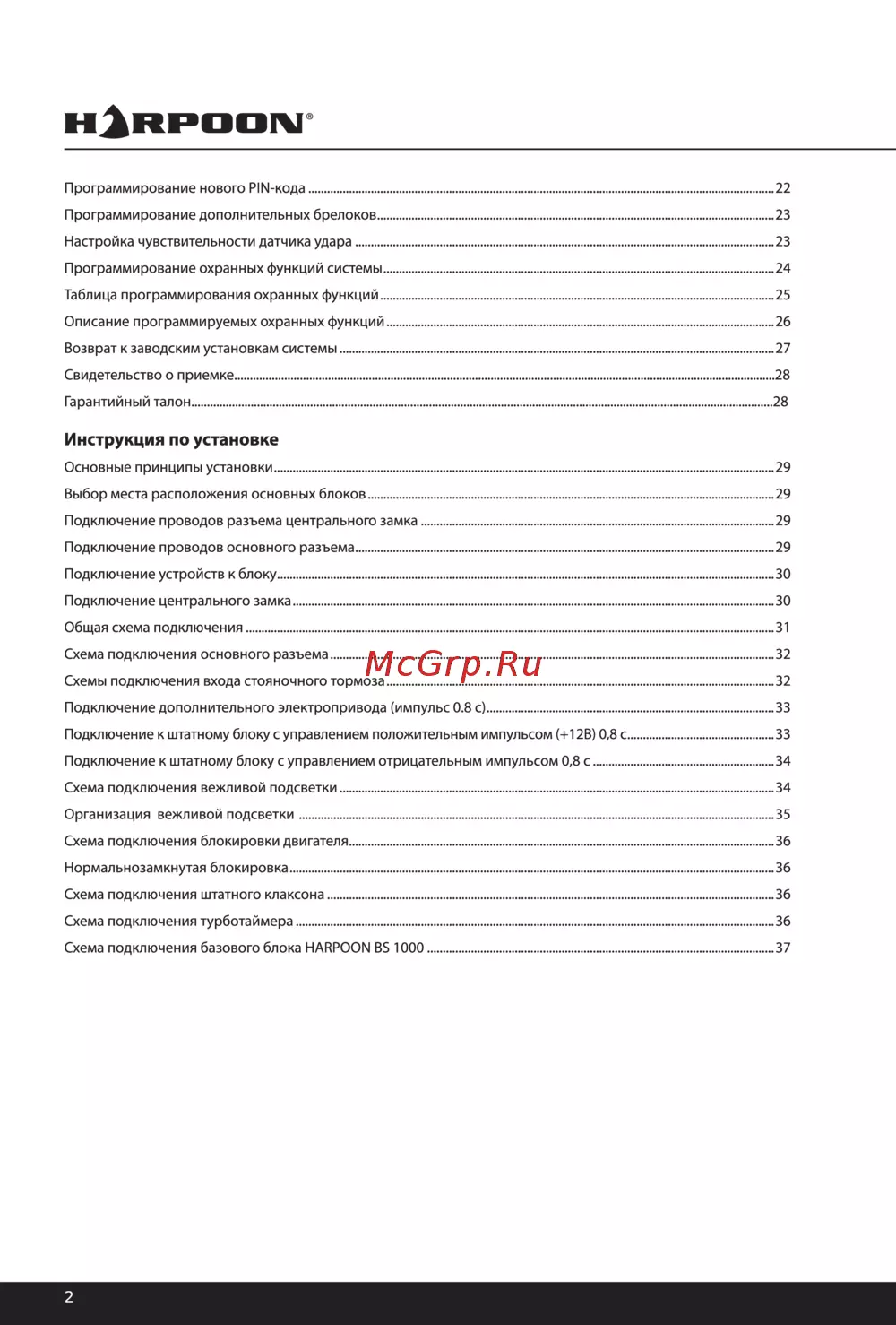 H RF OOI4I Программирование нового PIN кода 22 Программирование дополнительных брелоков 23 Настройка чувствительности датчика удара 23 Программирование охранных функций системы 24 Таблица программирования охранных функций 25 Описание программируемых охранных функций 26 Возврат к заводским установкам системы 27 Свидетельство о приемке 28 Гарантийный талон 28 Инструкция по установке Основные принципы установки 29 Выбор места расположения основных блоков 29 Подключение проводов разъема центрального замка 29 Подключение проводов основного разъема 29 Подключение устройств к блоку 30 Подключение центрального замка 30 Общая схема подключения 31 Схема подключения основного разъема 32 Схемы подключения входа стояночного тормоза 32 Подключение дополнительного электропривода импульс 0 8 с 33 Подключение к штатному блоку с управлением положительным импульсом 12В 0 8 с 33 Подключение к штатному блоку с управлением отрицательным импульсом 0 8 с 34 Схема подключения вежливой подсветки 34 Организация вежливой подсветки 35 Схема подключения блокировки двигателя 36 Нормальнозамкнутая блокировка 36 Схема подключения штатного клаксона 36 Схема подключения турботаймера 36 Схема подключения базового блока HARPOON BS 1000 37 2