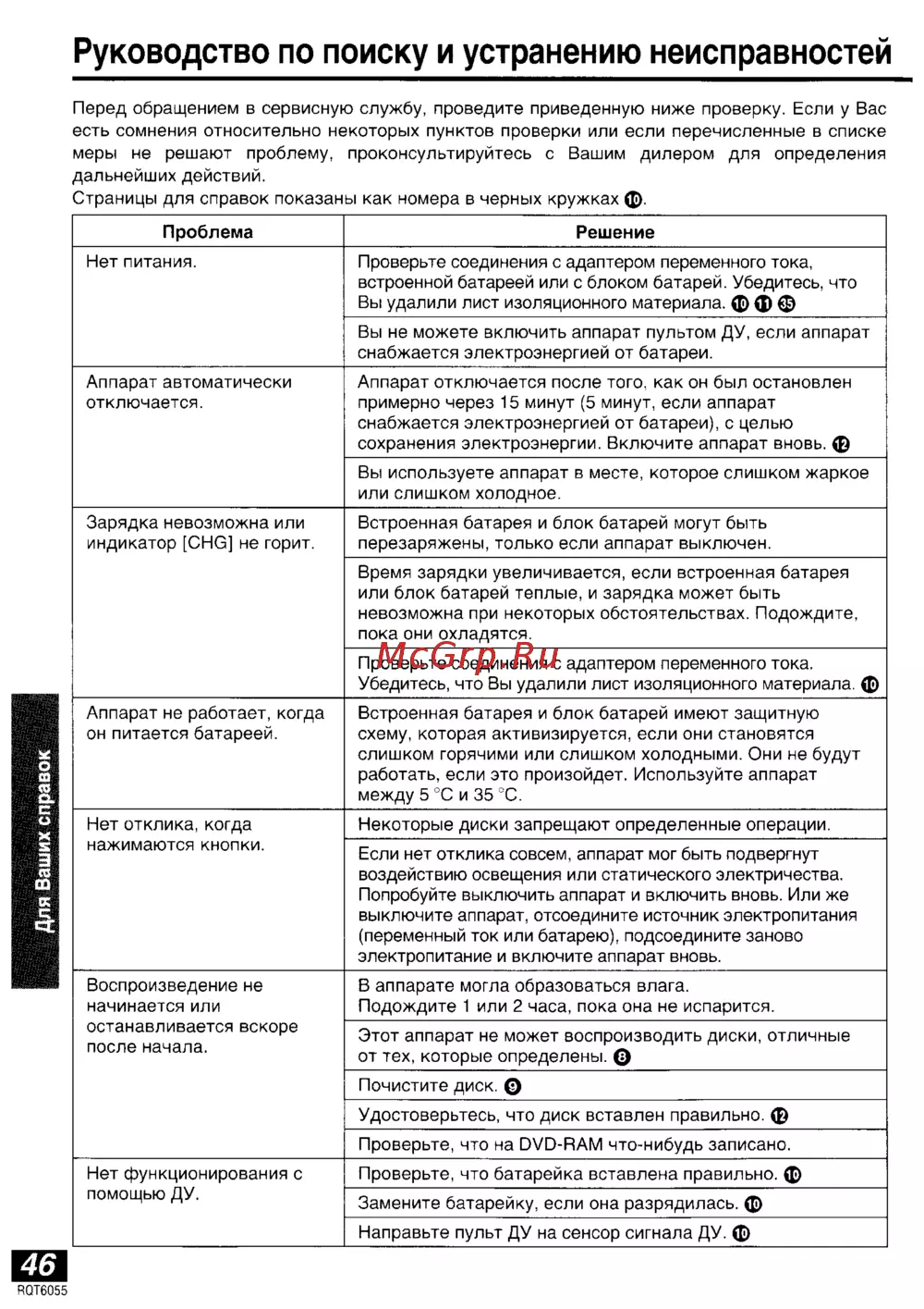 Руководство по поиску и устранению неисправностей Перед обращением в сервисную службу проведите приведенную ниже проверку Если у Вас есть сомнения относительно некоторых пунктов проверки или если перечисленные в списке меры не решают проблему проконсультируйтесь с Вашим дилером для определения дальнейших действий Страницы для справок показаны как номера в черных кружках ф Проблема Нет питания Решение Проверьте соединения с адаптером переменного тока встроенной батареей или с блоком батарей Убедитесь что Вы удалили лист изоляционного материала ф ф ф Вы не можете включить аппарат пультом ДУ если аппарат снабжается электроэнергией от батареи Аппарат автоматически отключается Аппарат отключается после того как он был остановлен примерно через 15 минут 5 минут если аппарат снабжается электроэнергией от батареи с целью сохранения электроэнергии Включите аппарат вновь ф Вы используете аппарат в месте которое слишком жаркое или слишком холодное Зарядка невозможна или индикатор СНЭ не горит Встроенная батарея и блок батарей могут быть перезаряжены только если аппарат выключен Время зарядки увеличивается если встроенная батарея или блок батарей теплые и зарядка может быть невозможна при некоторых обстоятельствах Подождите пока они охладятся Для Ваших справок Проверьте соединения с адаптером переменного тока Убедитесь что Вы удалили лист изоляционного материала ф Аппарат не работает когда он питается батареей Встроенная батарея и блок батарей имеют защитную схему которая активизируется если они становятся слишком горячими или слишком холодными Они не будут работать если это произойдет Используйте аппарат между 5 C и 35 C Нет отклика когда нажимаются кнопки Некоторые диски запрещают определенные операции Воспроизведение не начинается или останавливается вскоре после начала Если нет отклика совсем аппарат мог быть подвергнут воздействию освещения или статического электричества Попробуйте выключить аппарат и включить вновь Или же выключите аппарат отсоедините источник электропитания переменный ток или батарею подсоедините заново электропитание и включите аппарат вновь В аппарате могла образоваться влага Подождите 1 или 2 часа пока она не испарится Этот аппарат не может воспроизводить диски отличные от тех которые определены 0 Почистите диск Удостоверьтесь что диск вставлен правильно ф Проверьте что на DVD RAM что нибудь записано Нет функционирования с помощью ДУ Проверьте что батарейка вставлена правильно ф Замените батарейку если она разрядилась ф Направьте пульт ДУ на сенсор сигнала ДУ ф 46 RQT6055