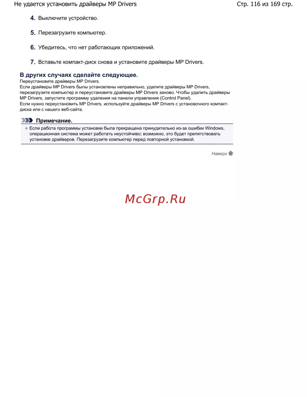 Стр. 116 из 169 стр.Не удается установить драйверы MP Drivers