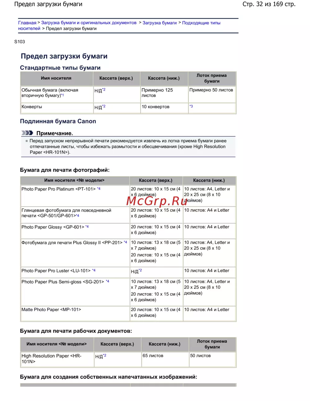 Стр. 32 из 169 стр.Предел загрузки бумаги