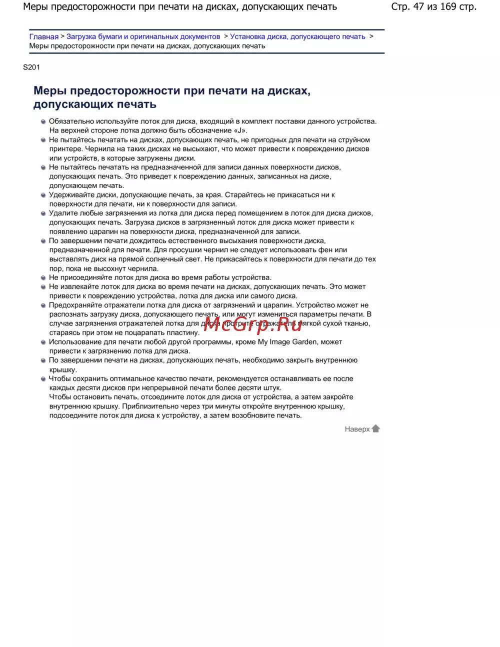 Стр. 47 из 169 стр.Меры предосторожности при печати на дисках, допускающих печать