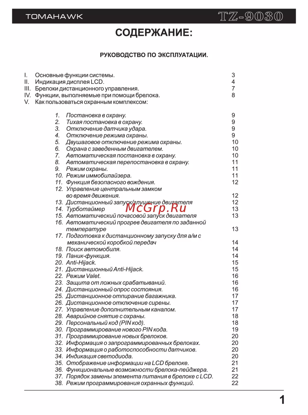 TOMAHAWK СОДЕРЖАНИЕ РУКОВОДСТВО ПО ЭКСПЛУАТАЦИИ I II III IV V Основные функции системы Индикация дисплея LCD Брелоки дистанционного управления Функции выполняемые при помощи брелока Как пользоваться охранным комплексом 1 Постановка в охрану 2 Тихая постановка в охрану 3 Отключение датчика удара 4 Отключение режима охраны 5 Двушаговое отключение режима охраны 6 Охрана с заведенным двигателем 7 Автоматическая постановка в охрану 8 Автоматическая перепостановка в охрану 9 Режим охраны 10 Режим иммобилайзера 11 Функция безопасного вождения 12 Управление центральным замком во время движения 13 Дистанционный запуск глушение двигателя 14 Турботаймер 15 Автоматический почасовой запуск двигателя 16 Автоматический прогрев двигателя по заданной температуре 17 Подготовка к дистанционному запуску для а м с механической коробкой передач 18 Поиск автомобиля 19 Паник функция 20 Anti Hijack 21 Дистанционный Anti Hijack 22 Режим Valet 23 Защита от ложных срабатываний 24 Дистанционный опрос состояния 25 Дистанционное отпирание багажника 26 Дистанционное отключение сирены 27 Управление дополнительным каналом 28 Аварийное снятие с охраны 29 Персональный код PIN код 30 Программирование нового PIN кода 31 Программирование новых брелоков 32 Информация о запрограммированных брелоках 33 Информация о работоспособности датчиков 34 Индикация светодиода 35 Отображение информации на LCD брелоке 36 Функциональные возможности брелока пейджера 37 Порядок замены элемента питания в брелоке с LCD 38 Режим программирования охранных функций 3 4 7 8 9 9 9 9 10 10 10 11 11 11 12 12 12 13 13 13 14 14 14 15 15 16 16 16 17 17 17 18 18 19 20 20 20 20 21 21 22 22 1