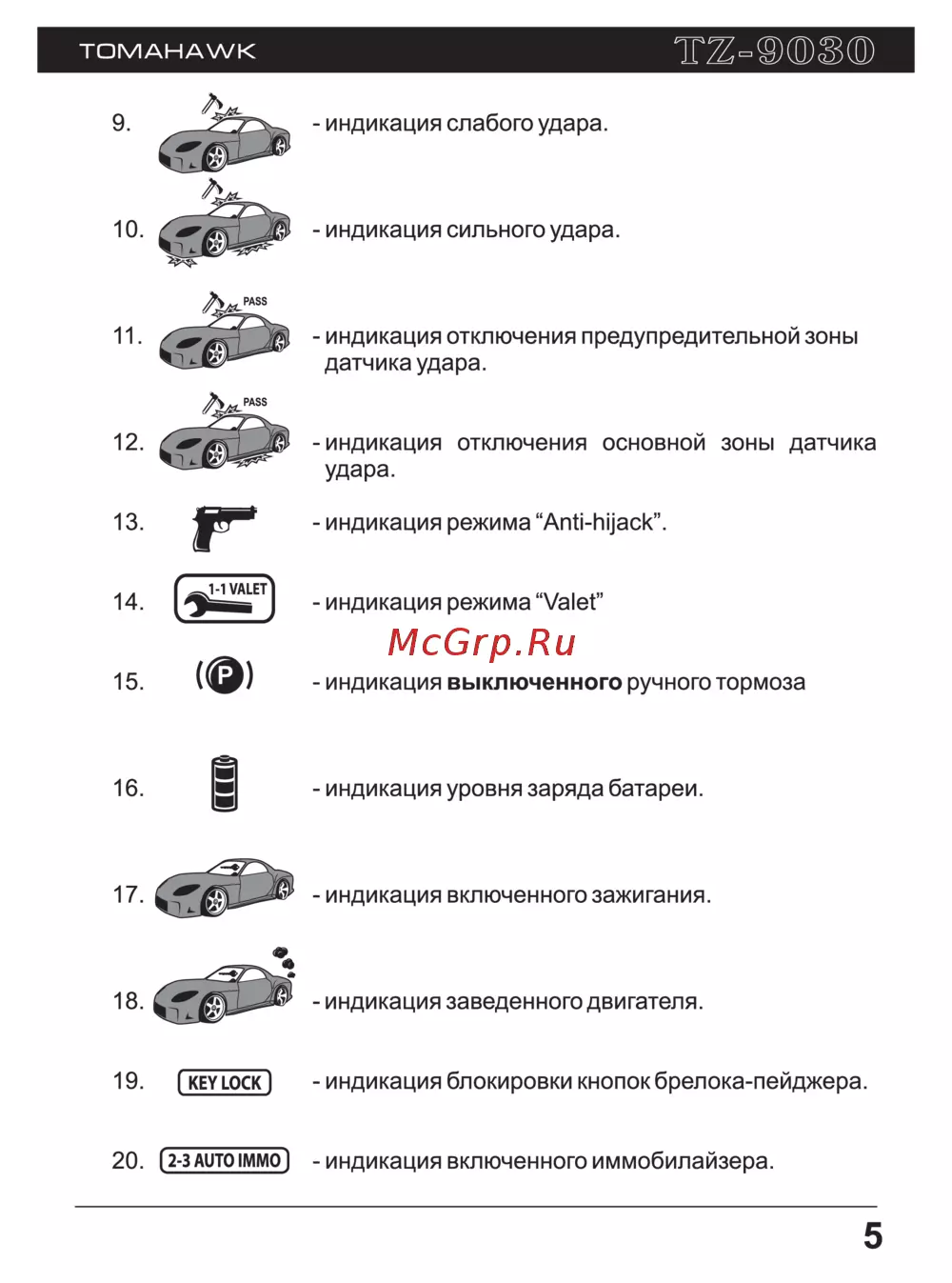 Tomahawk TZ-9030 — индикация различных режимов и состояний системы безопасности [5/40]