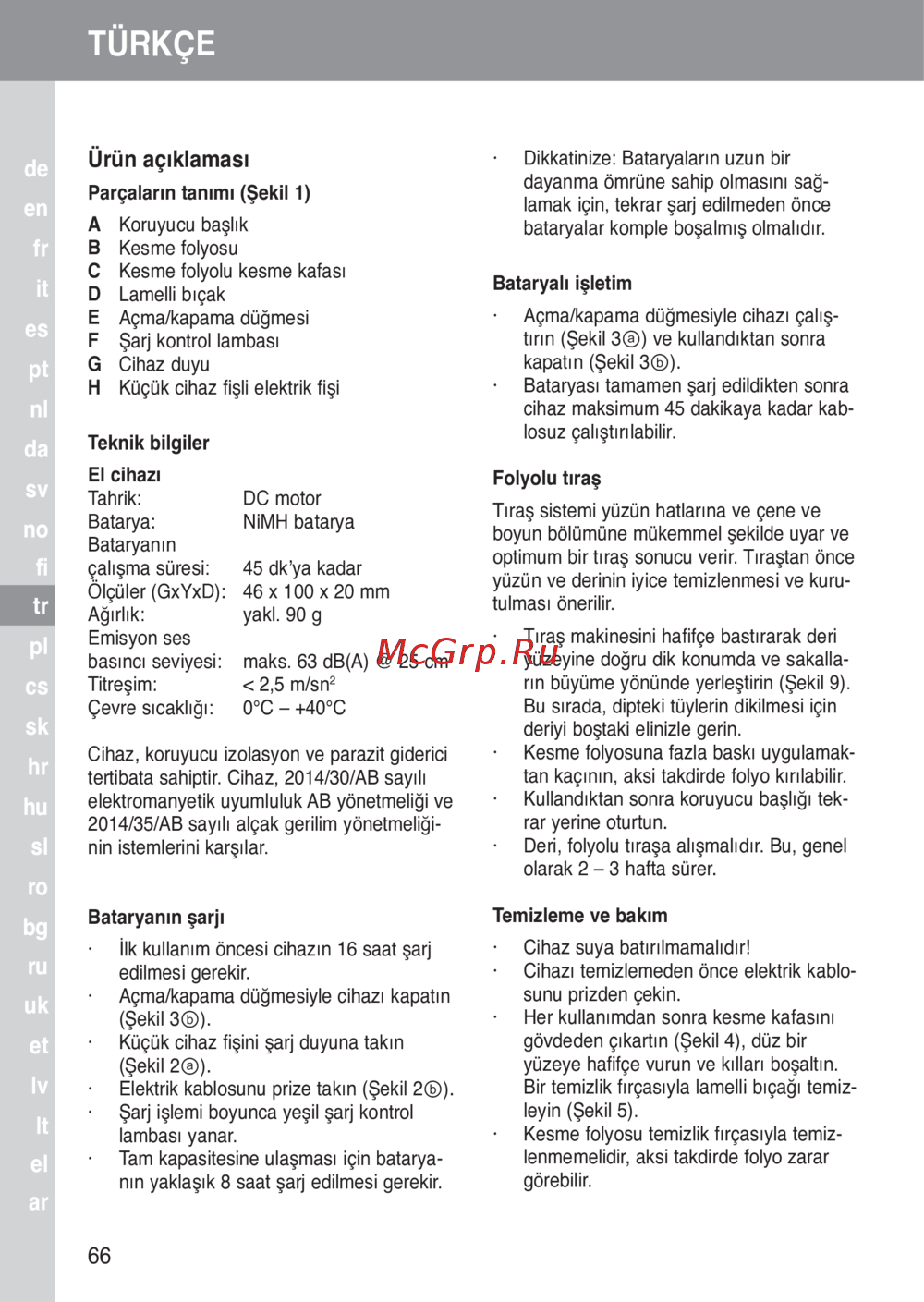 - Neuzglabājiet un nelietojiet ierīci ar pārlocītu vai savērptu barošanas kabeli izmantojiet un uzglabājiet ierīci tikai sausās telpās iekārtas uzlādēšanai izmantojiet tikai ar to kopā piegādāto uzlādes ierīci bojātu barošanas kabeli nomainiet tikai ar oriģinālajām rezerves daļām kas ir pieejamas mūsu servisa centros necentieties pašrocīgi mainīt akumulatorus akumulatoru nomaiņu drīkst veikt tikai servisa centrā ievērojot ražotāja norādītos akumulatora tipus nekad neizmantojiet ierīci ar bojātu asmeņu bloku ražotājs neuzņemas nekādu atbildību par bojā jumiem kas var rasties nepareizas lietošanas vai šīs lietošanas instrukcijas neievērošanas rezultātā p.129