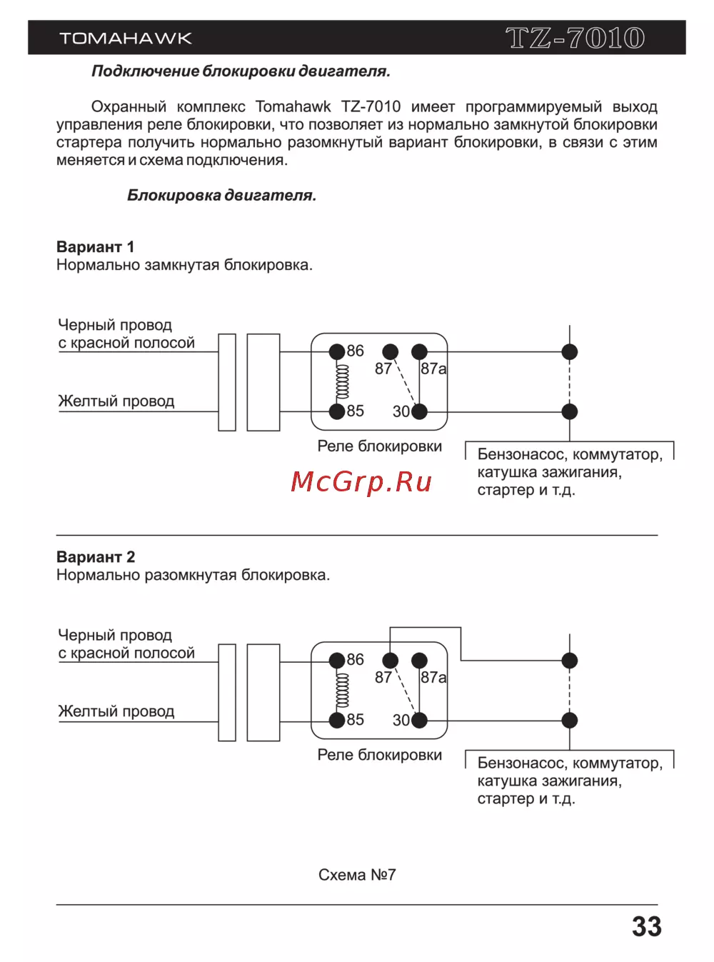 Т 7 Ш TOMAHAWK Подключение блокировки двигателя Охранный комплекс Tomahawk TZ 7010 имеет программируемый выход управления реле блокировки что позволяет из нормально замкнутой блокировки стартера получить нормально разомкнутый вариант блокировки в связи с этим меняется и схема подключения Блокировка двигателя Вариант 1 Нормально замкнутая блокировка Черный провод с красной полосой Желтый провод Вариант 2 Нормально разомкнутая блокировка Черный провод с красной полосой Желтый провод Схема 7 33
