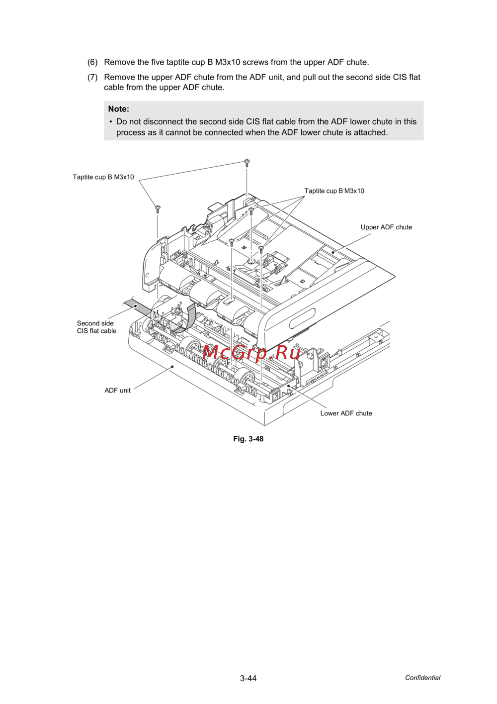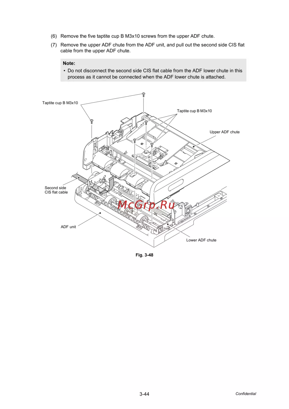 • Do not disconnect the second side CIS flat cable from the ADF lower chute in this