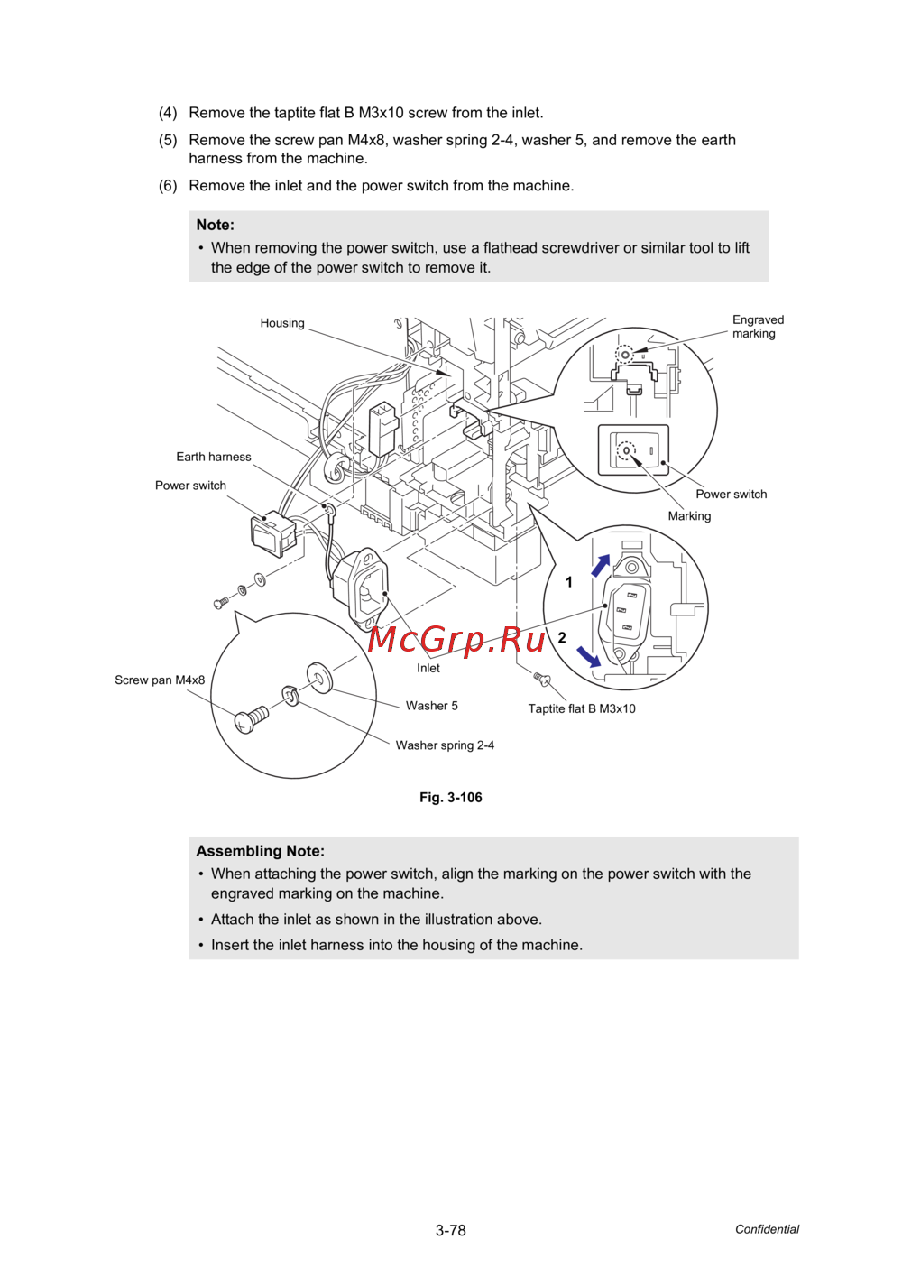 (6) Remove the inlet and the power switch from the machine.