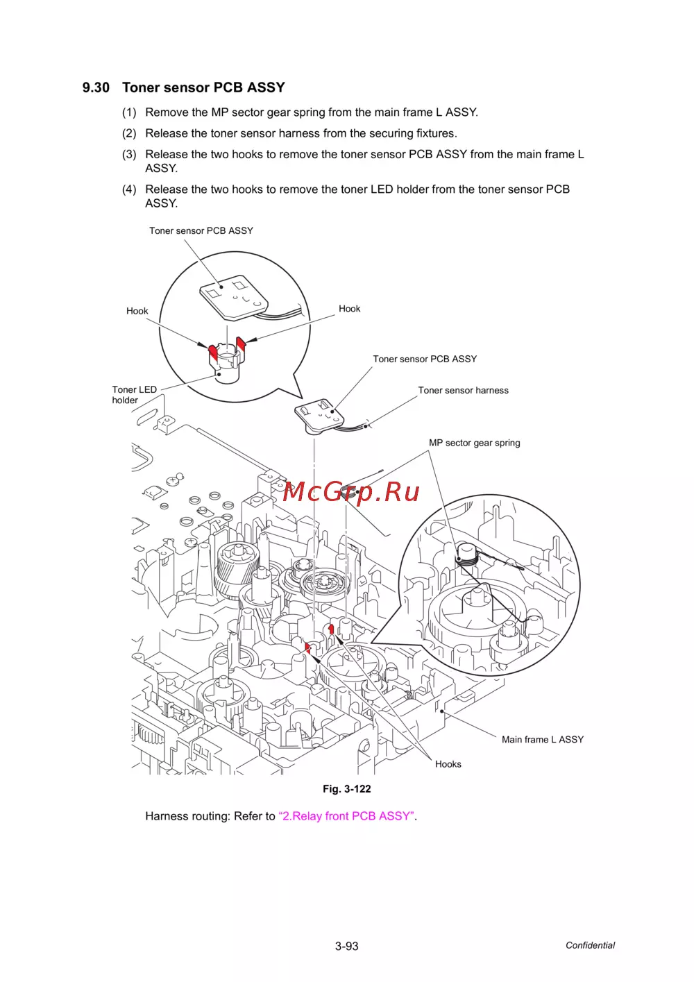 (3) Release the two hooks to remove the toner sensor PCB ASSY from the main frame L