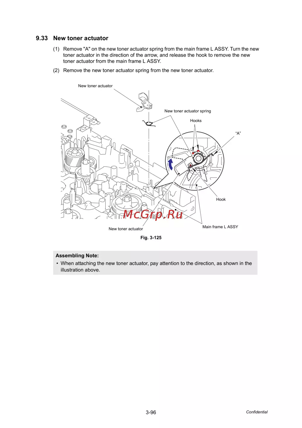 (1) Remove "A" on the new toner actuator spring from the main frame L ASSY. Turn the new