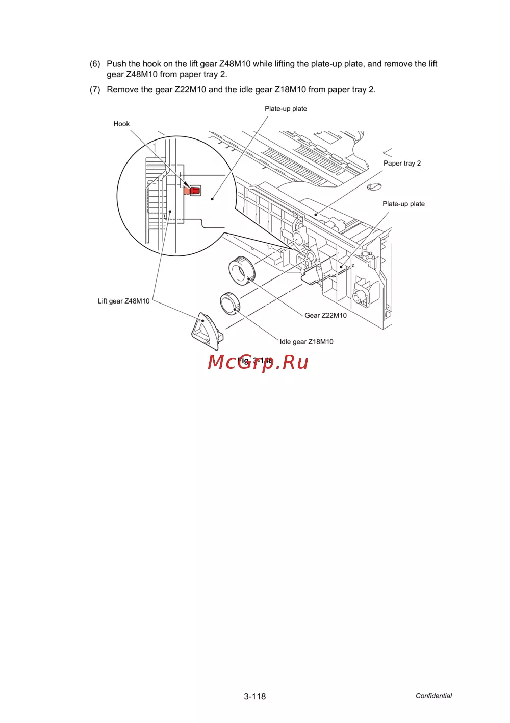 (6) Push the hook on the lift gear Z48M10 while lifting the plate-up plate, and remove the lift