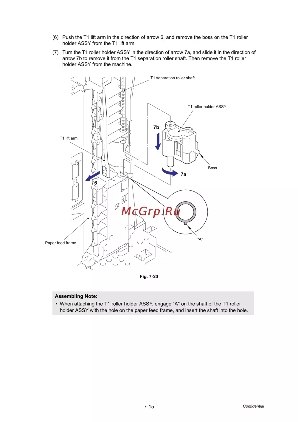 arrow 7b to remove it from the T1 separation roller shaft. Then remove the T1 roller