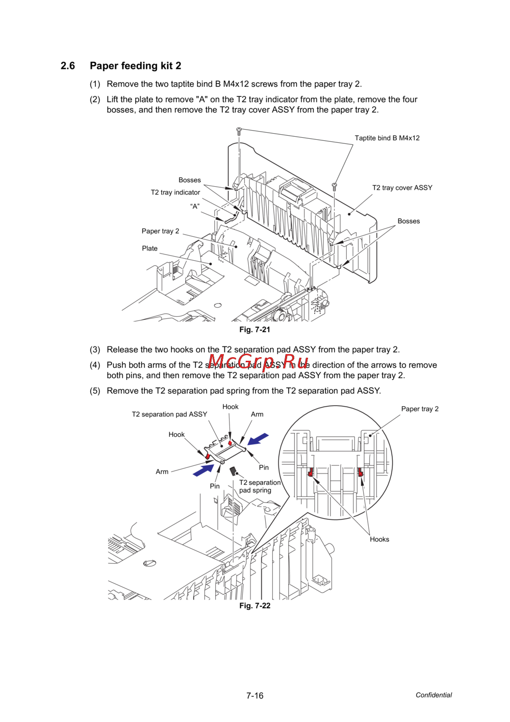 both pins, and then remove the T2 separation pad ASSY from the paper tray 2.