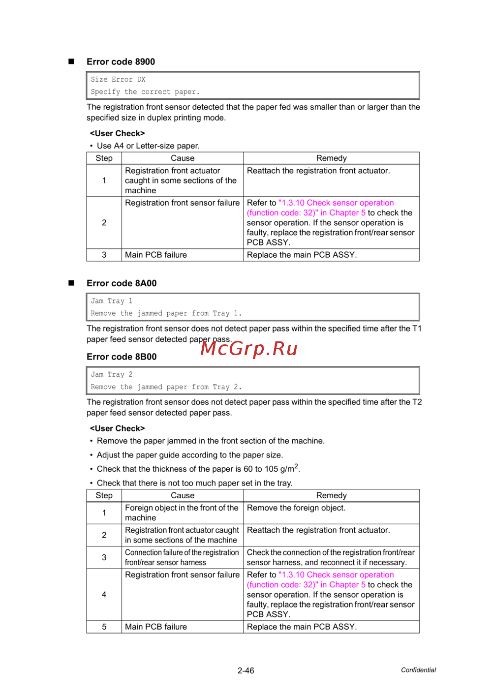 Registration front sensor failure Refer to "1.3.10 Check sensor operation