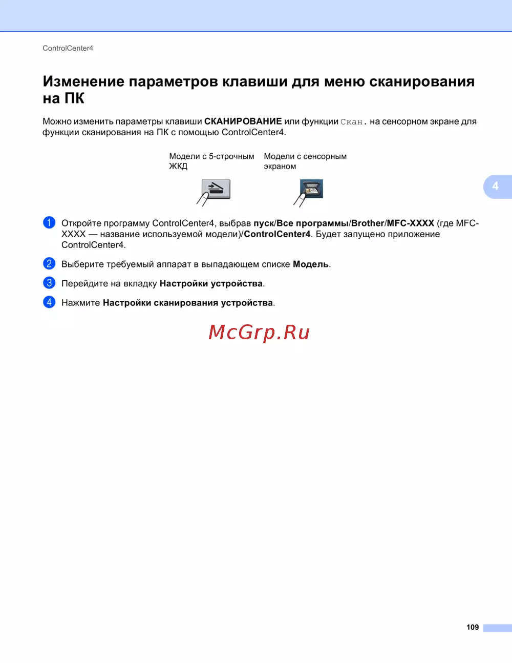 a Откройте программу ControlCenter4, выбрав пуск/Все программы/Brother/MFC-XXXX (где MFC-