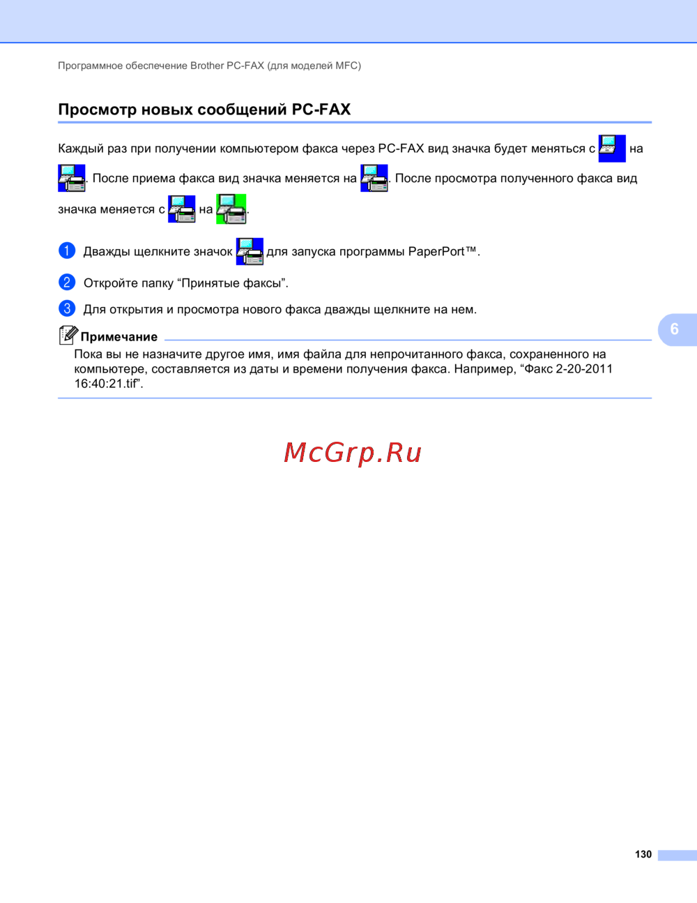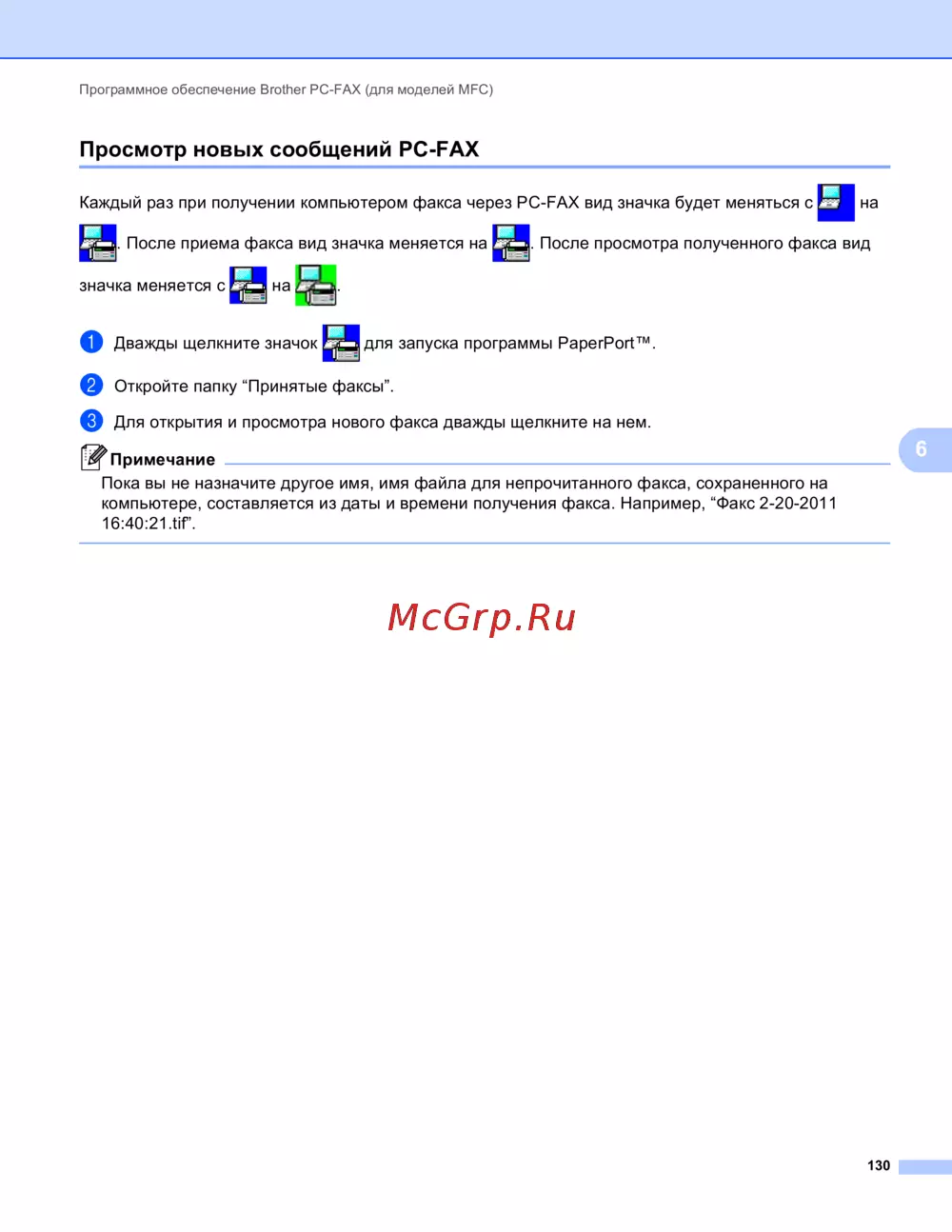 Каждый раз при получении компьютером факса через PC-FAX вид значка будет меняться с на