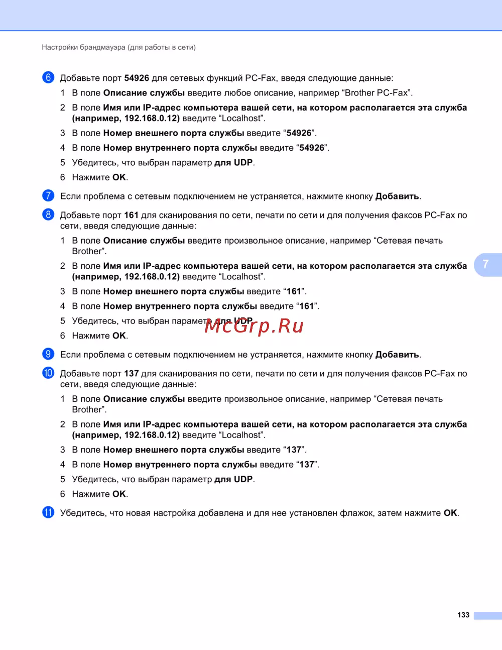 j Добавьте порт 137 для сканирования по сети, печати по сети и для получения факсов PC-Fax по