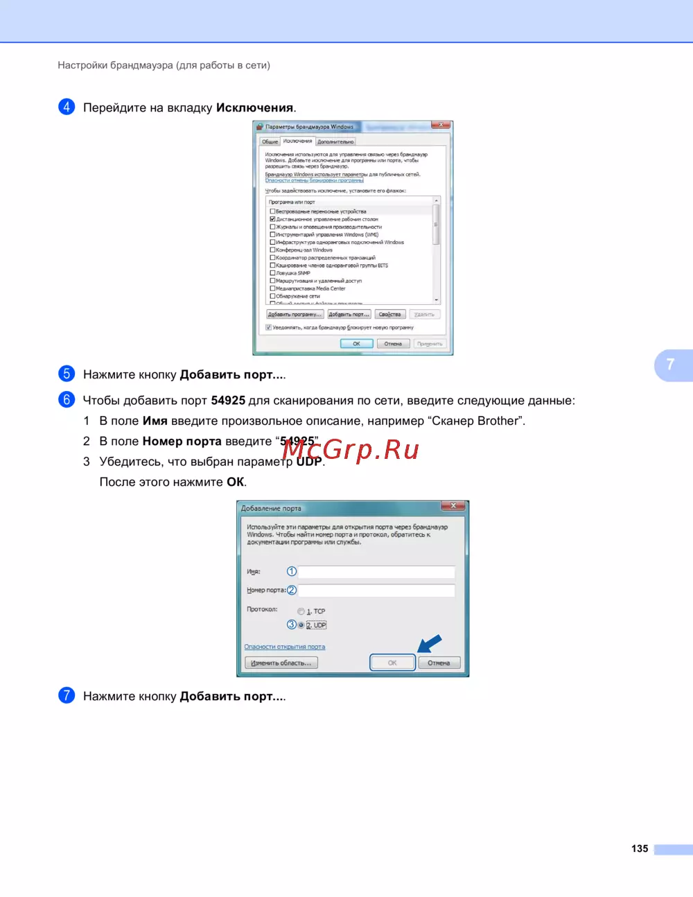 f Чтобы добавить порт 54925 для сканирования по сети, введите следующие данные: