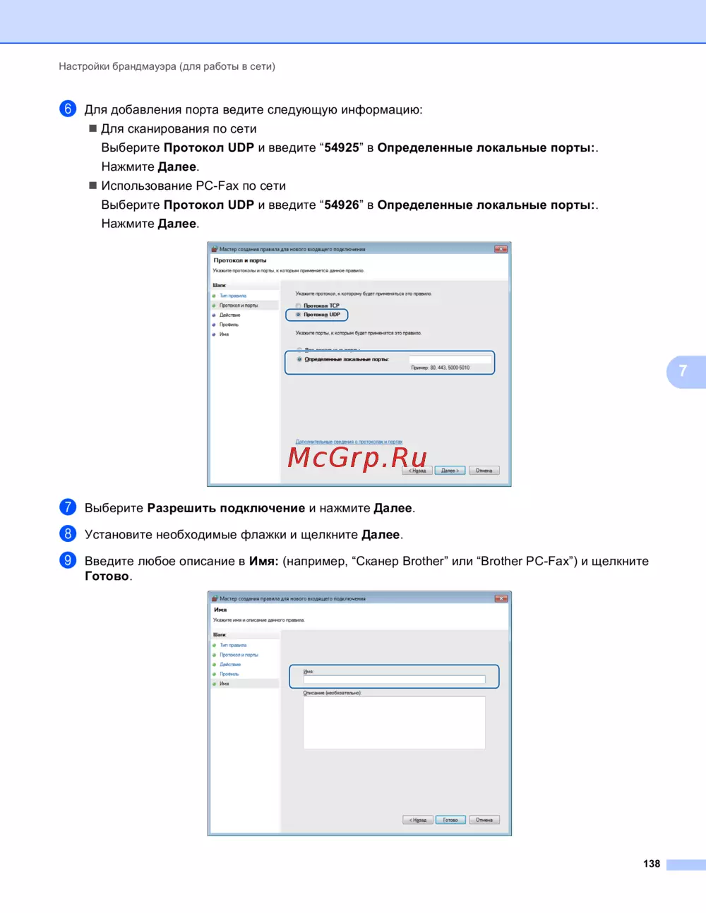i Введите любое описание в Имя: (например, “Сканер Brother” или “Brother PC-Fax”) и щелкните