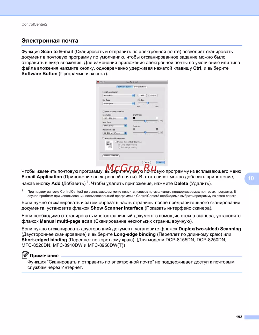 - Сканирование и отправка по электронной почте сервер электронной почты для модели dcp 8250dn mfc 8910dw и mfc 8950dw t доступно по умолчанию для моделей mfc 8510dn и mfc 8520dn доступно в виде загружаемых файлов p.249