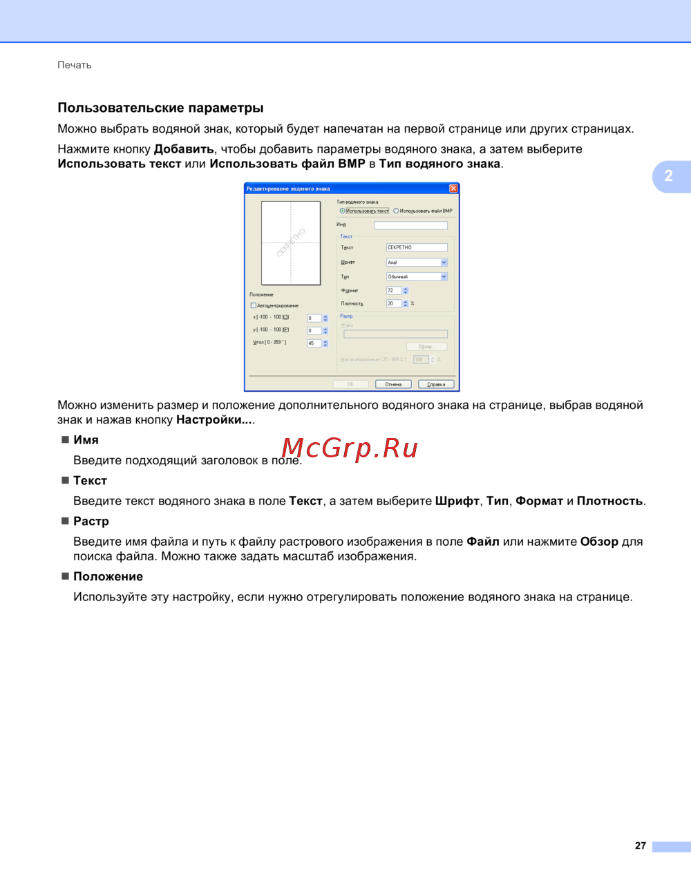 Можно изменить размер и положение дополнительного водяного знака на странице, выбрав водяной