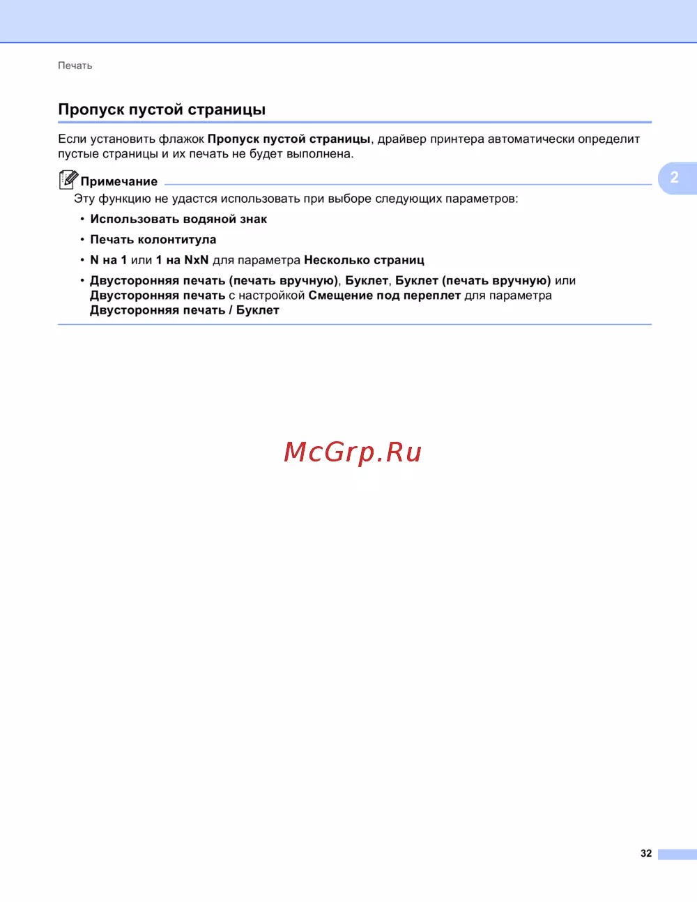 Узнайте, как настроить печать, включая функцию пропуска пустых страниц и ограничения при использовании водяных знаков и двусторонней печати.