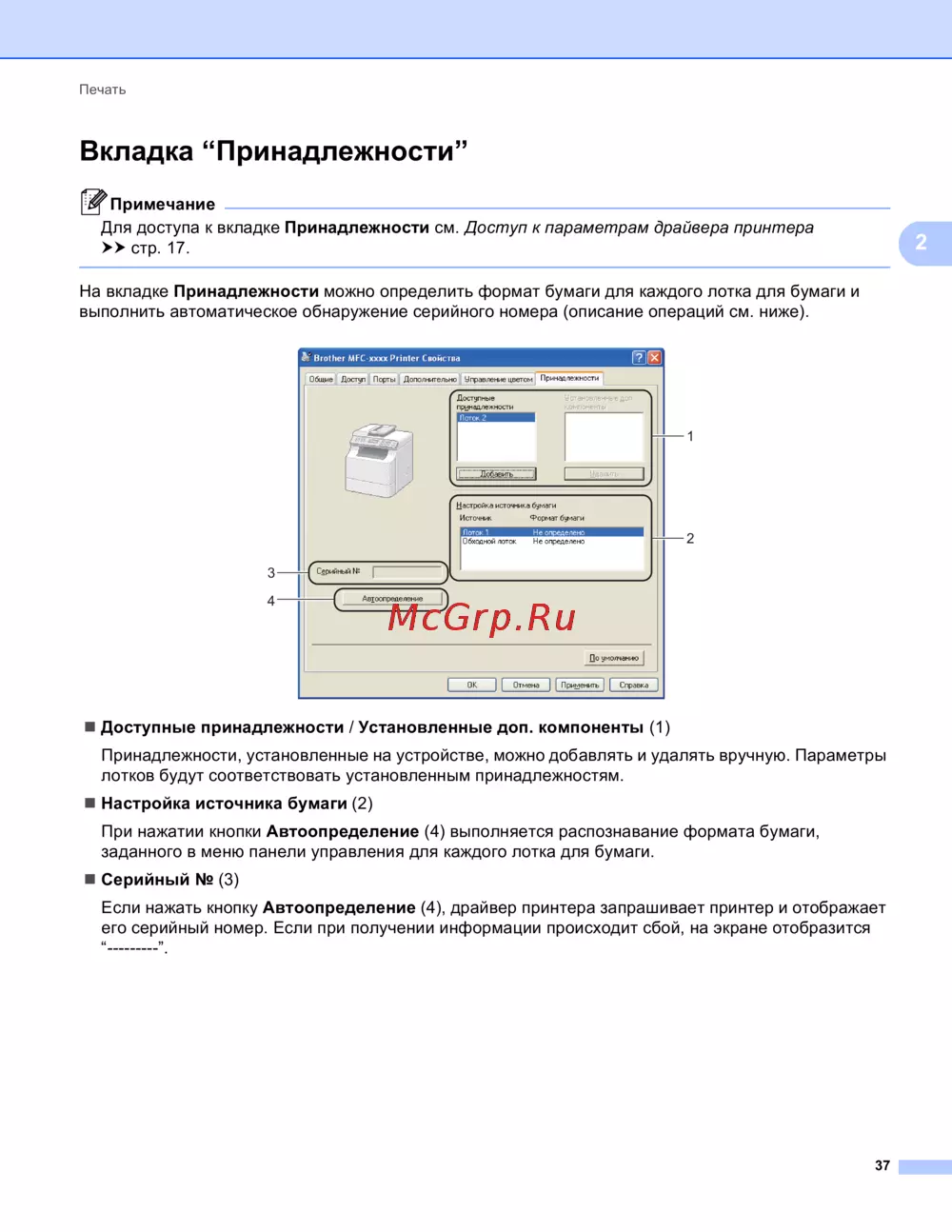 Если нажать кнопку Автоопределение (4), драйвер принтера запрашивает принтер и отображает