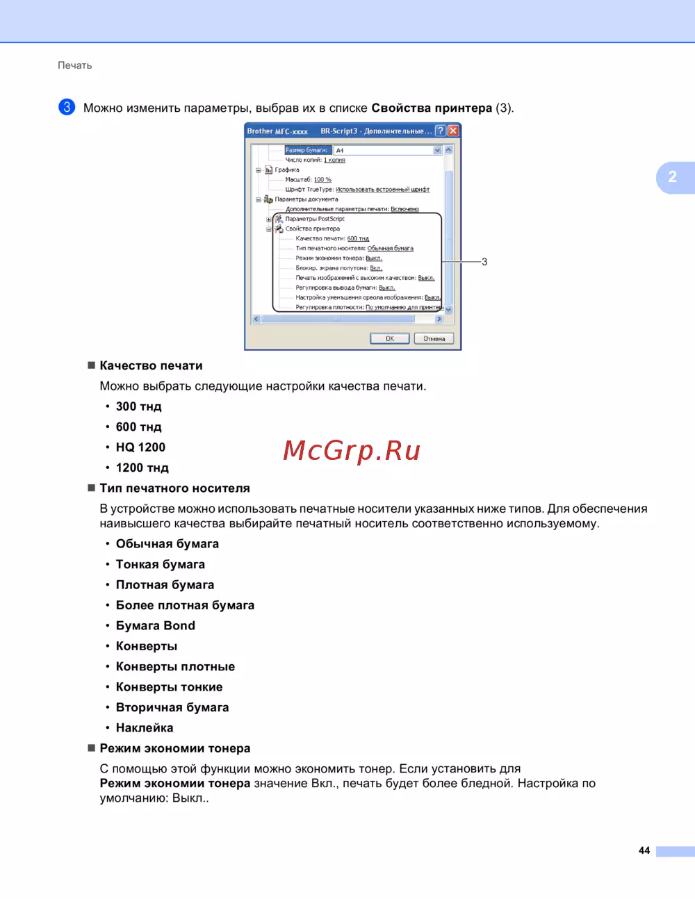 c Можно изменить параметры, выбрав их в списке Свойства принтера (3).