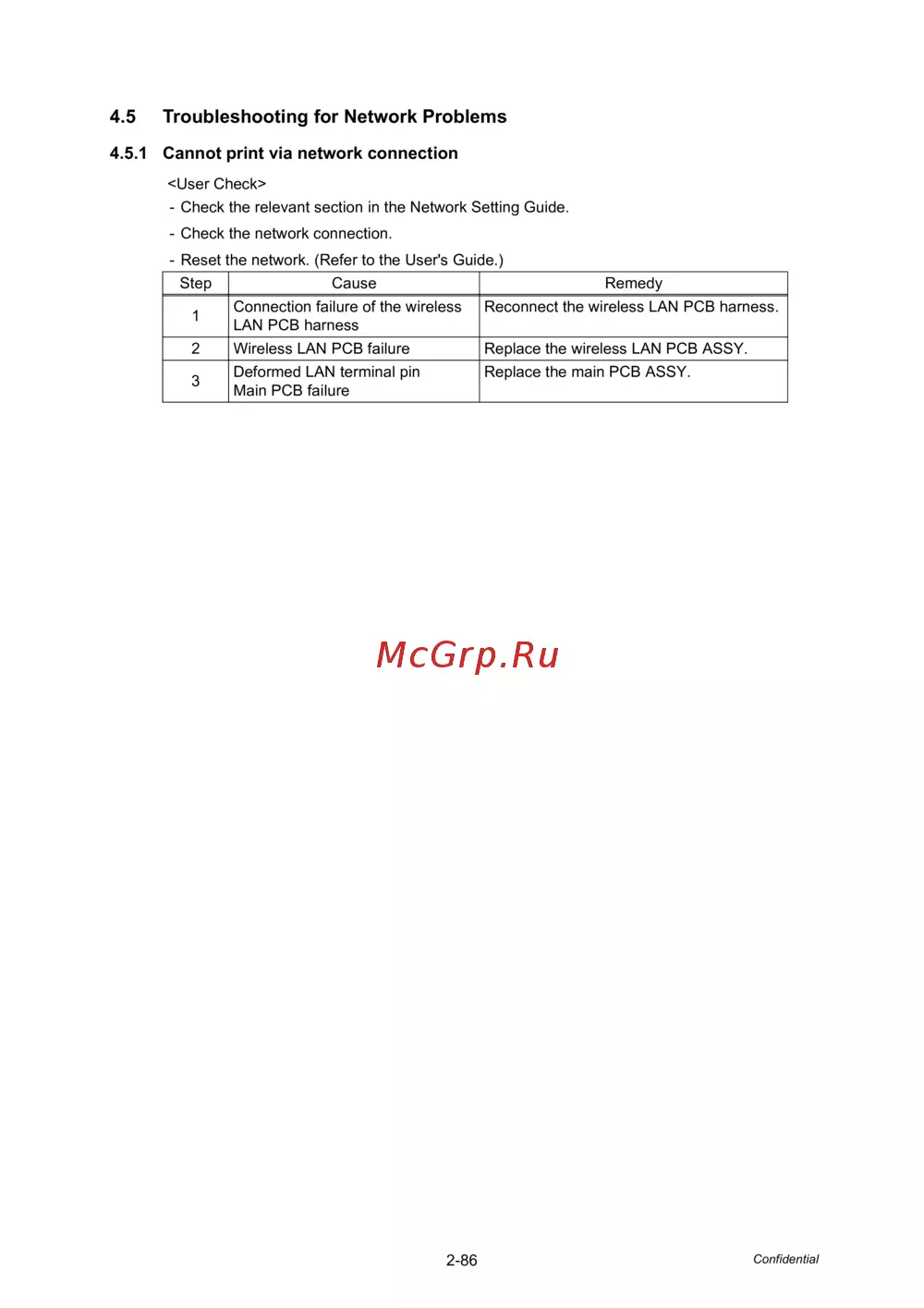 2 Wireless LAN PCB failure Replace the wireless LAN PCB ASSY.