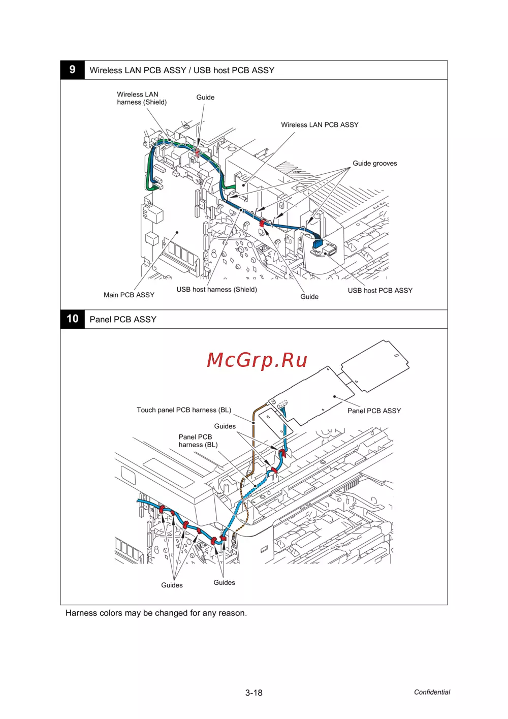 - 8 disconnect the second side cis flat cable duplex scanning models only first side cis flat cable adf cover document detection sensor harness second side document scanning position sensor harness adf motor harness document scanner motor harness panel pcb harness wireless lan harness models with wireless lan only usb host harness speaker harness models with speaker only and ncu harness models with ncu only from the main pcb assy and release these harnesses from the securing fixtures p.360