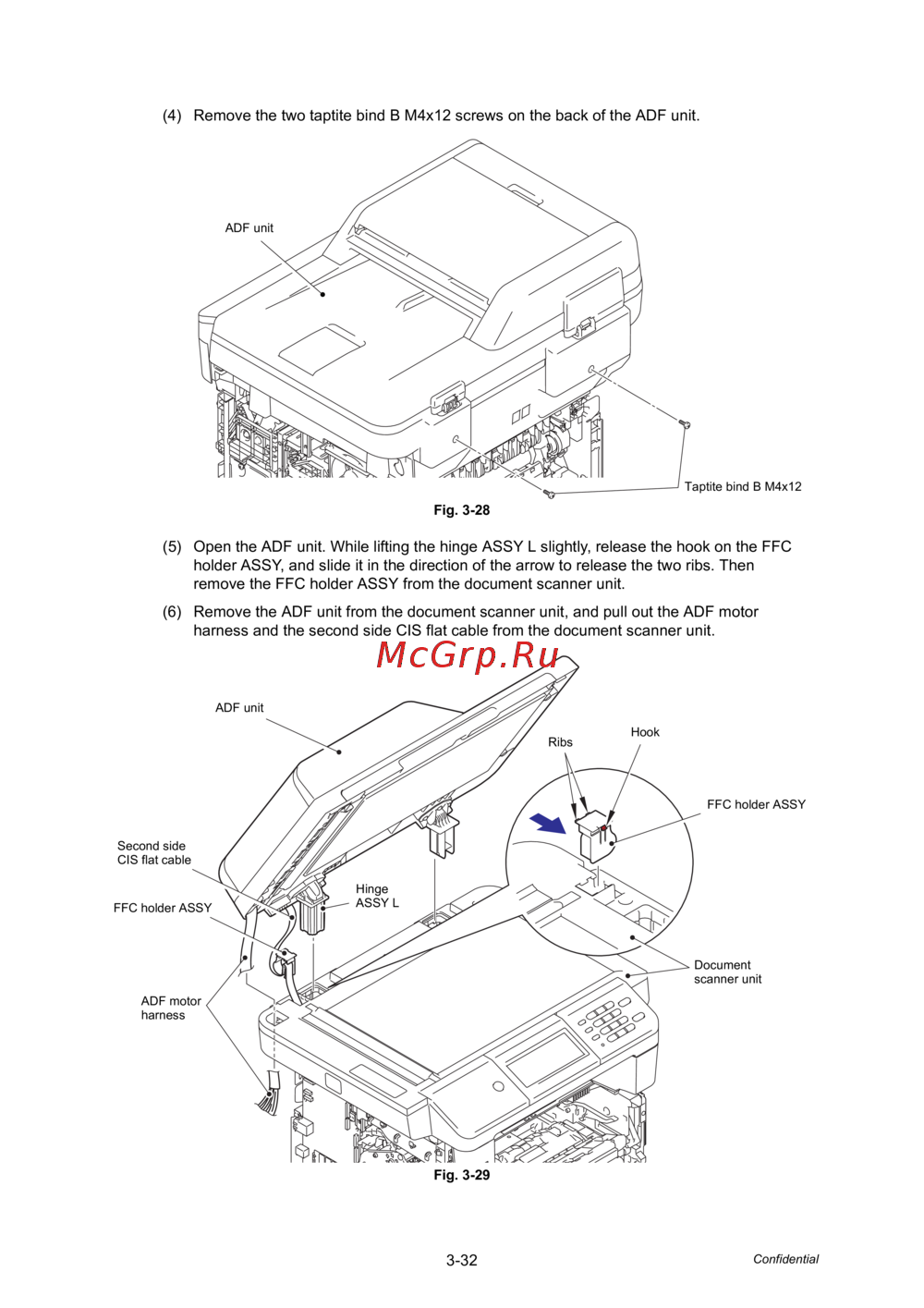 Brother DCP-8110D [178/373] 5 open the adf unit while lifting the hinge assy l slightly release the hook on the ffc holder assy and slide it in the direction of the arrow to release the two ribs then remove the ffc holder assy from the document scanner unit