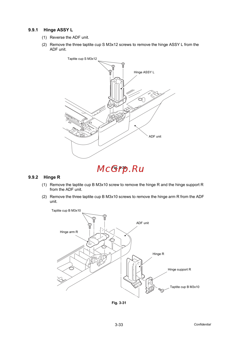 (2) Remove the three taptite cup B M3x10 screws to remove the hinge arm R from the ADF