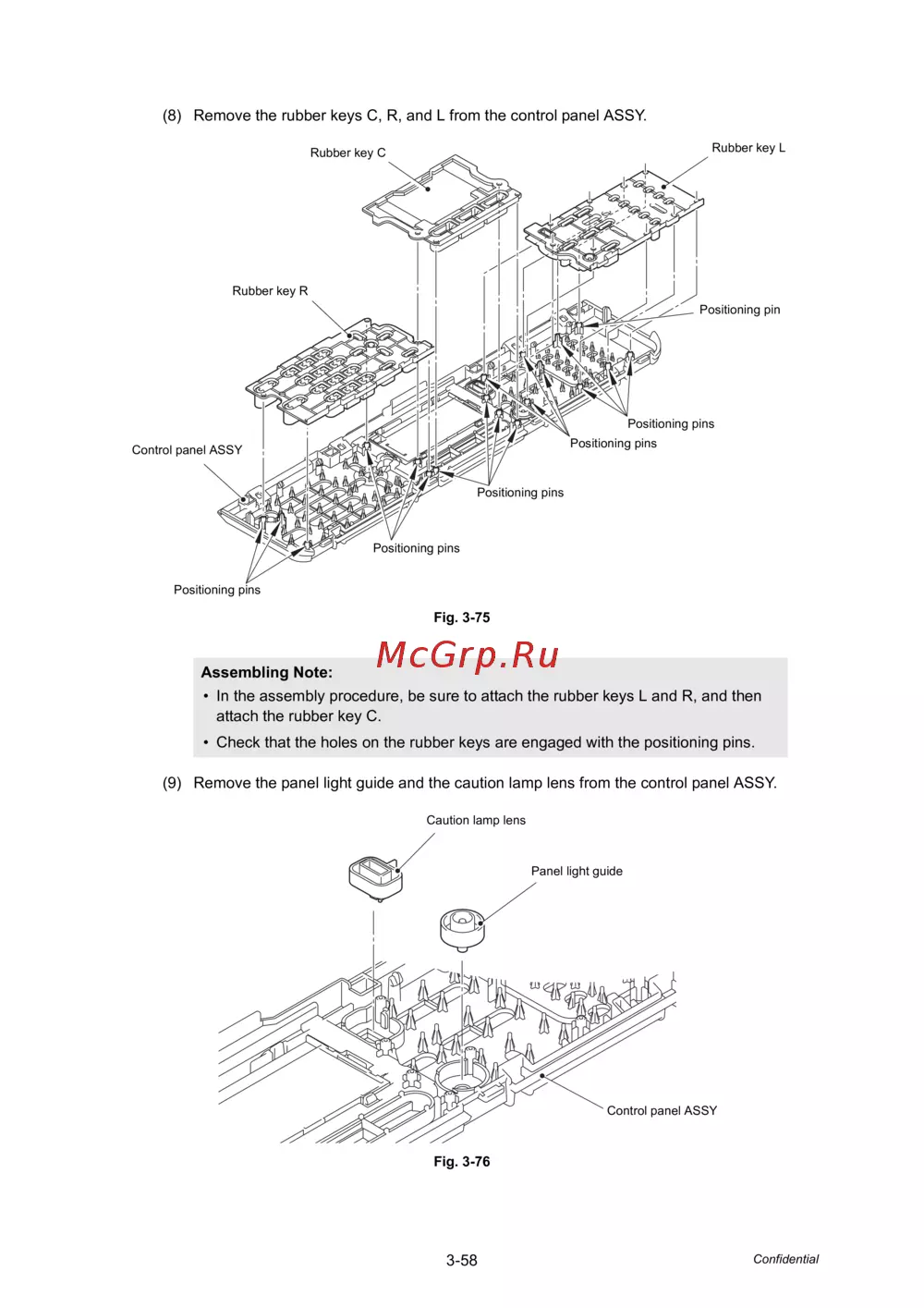 (8) Remove the rubber keys C, R, and L from the control panel ASSY.