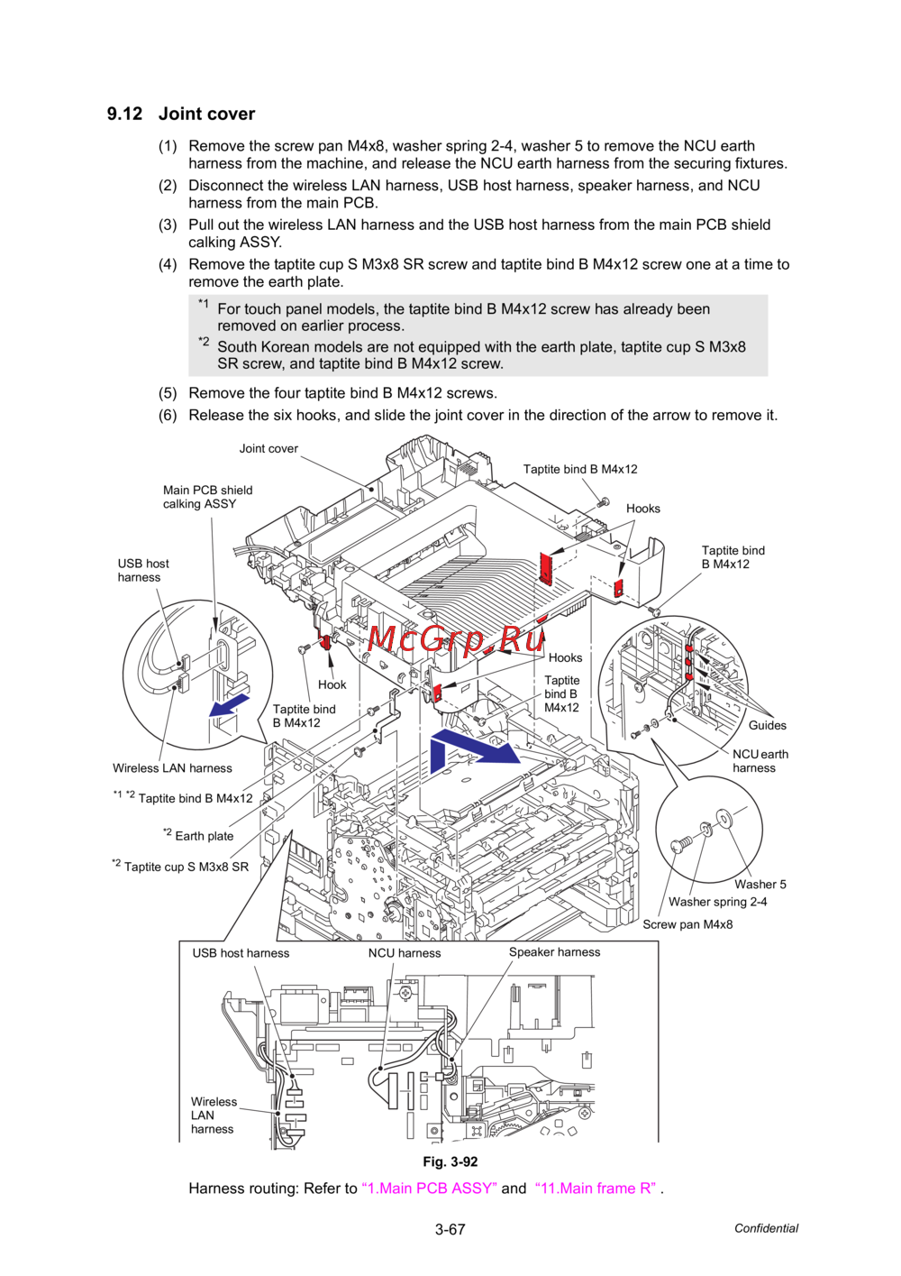 - 8 disconnect the second side cis flat cable duplex scanning models only first side cis flat cable adf cover document detection sensor harness second side document scanning position sensor harness adf motor harness document scanner motor harness panel pcb harness wireless lan harness models with wireless lan only usb host harness speaker harness models with speaker only and ncu harness models with ncu only from the main pcb assy and release these harnesses from the securing fixtures p.360