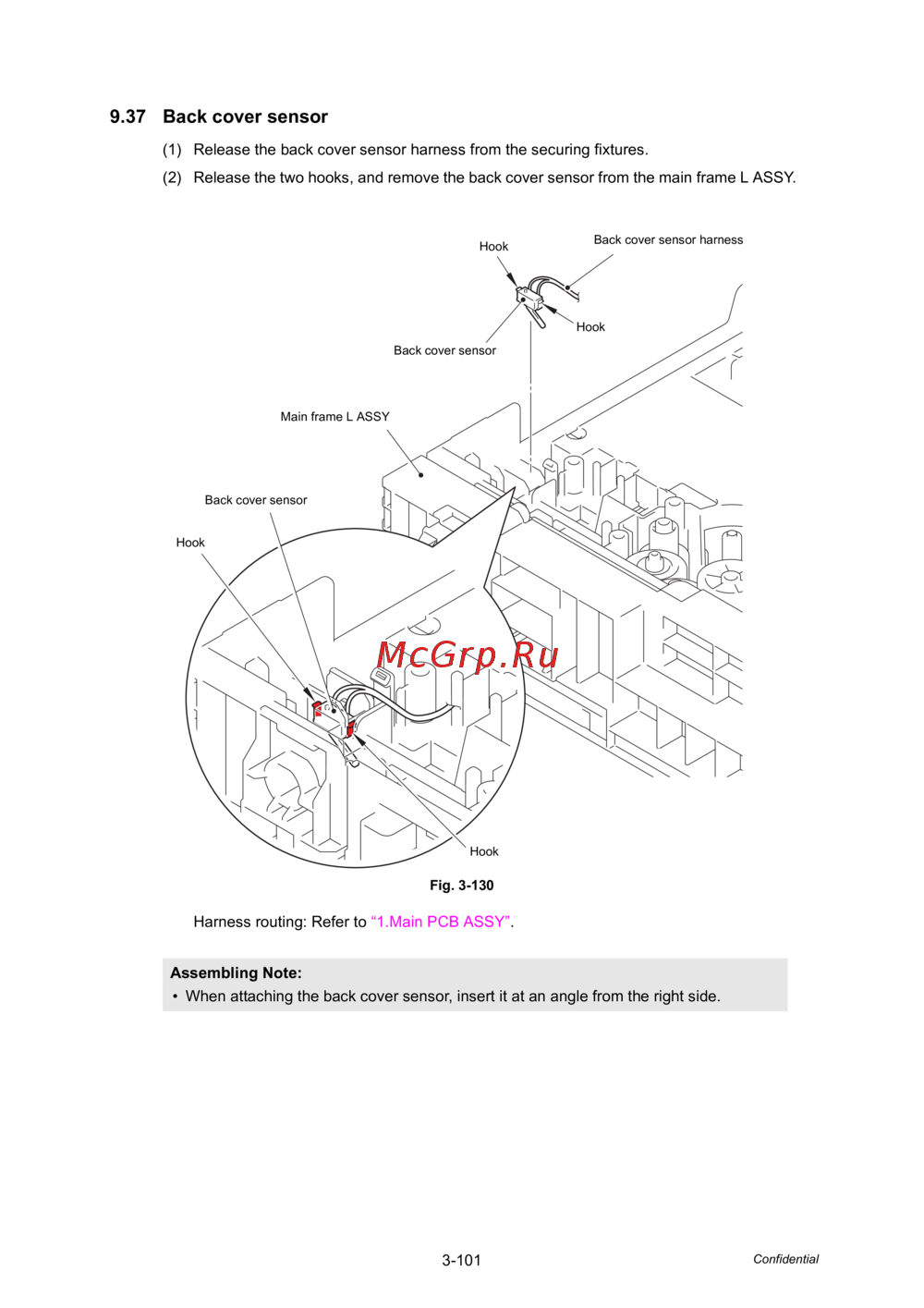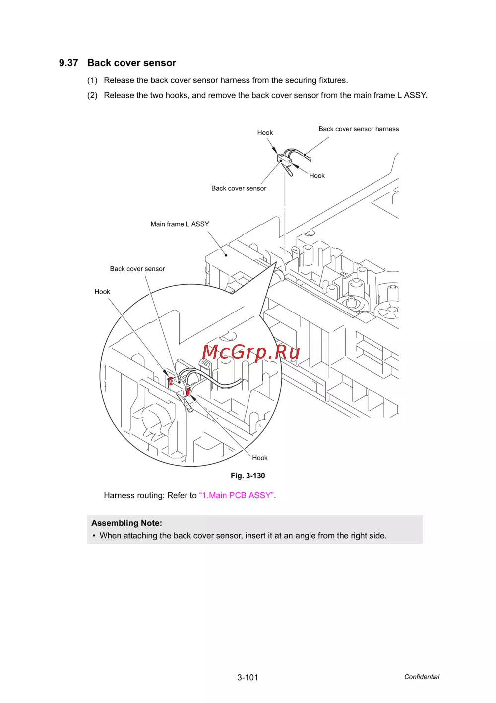 (2) Release the two hooks, and remove the back cover sensor from the main frame L ASSY.